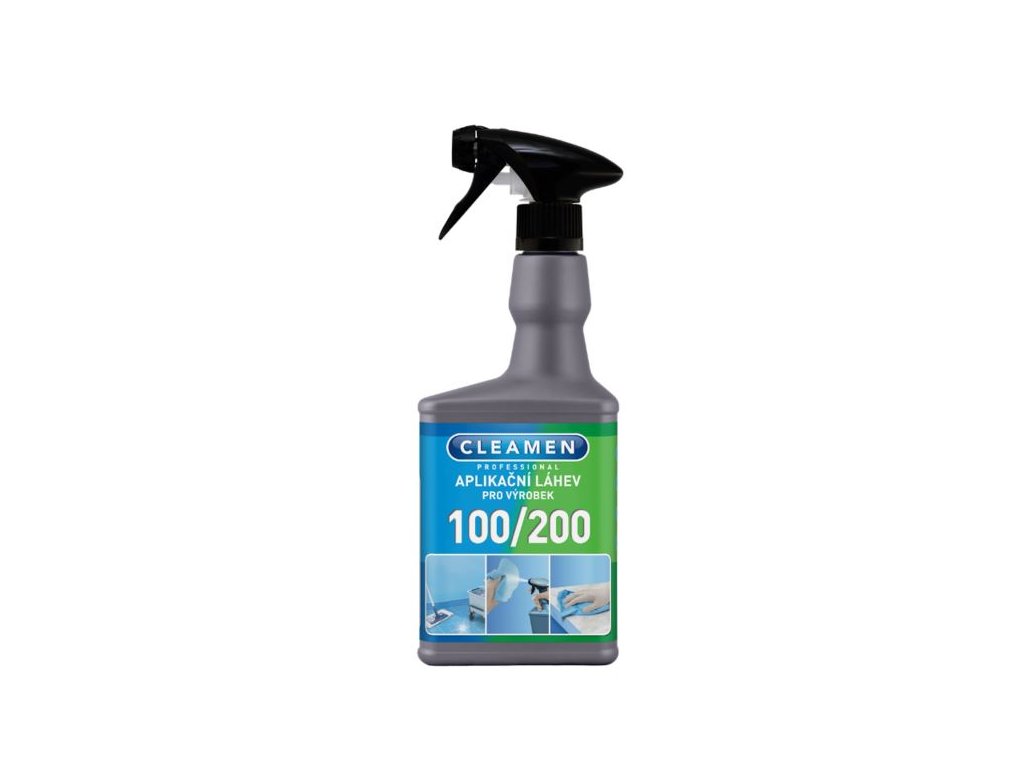 Láhev naplňte přiměřeným množstvím vody a poté nadávkujte CLEAMEN 100/200 dle doporučeného ředění uvedeného v tabulce na etiketě koncentrovaného prostředku. Našroubujte rozprašovač a rovnoměrně nanášejte na čištěný povrch nebo do úklidové utěrky.