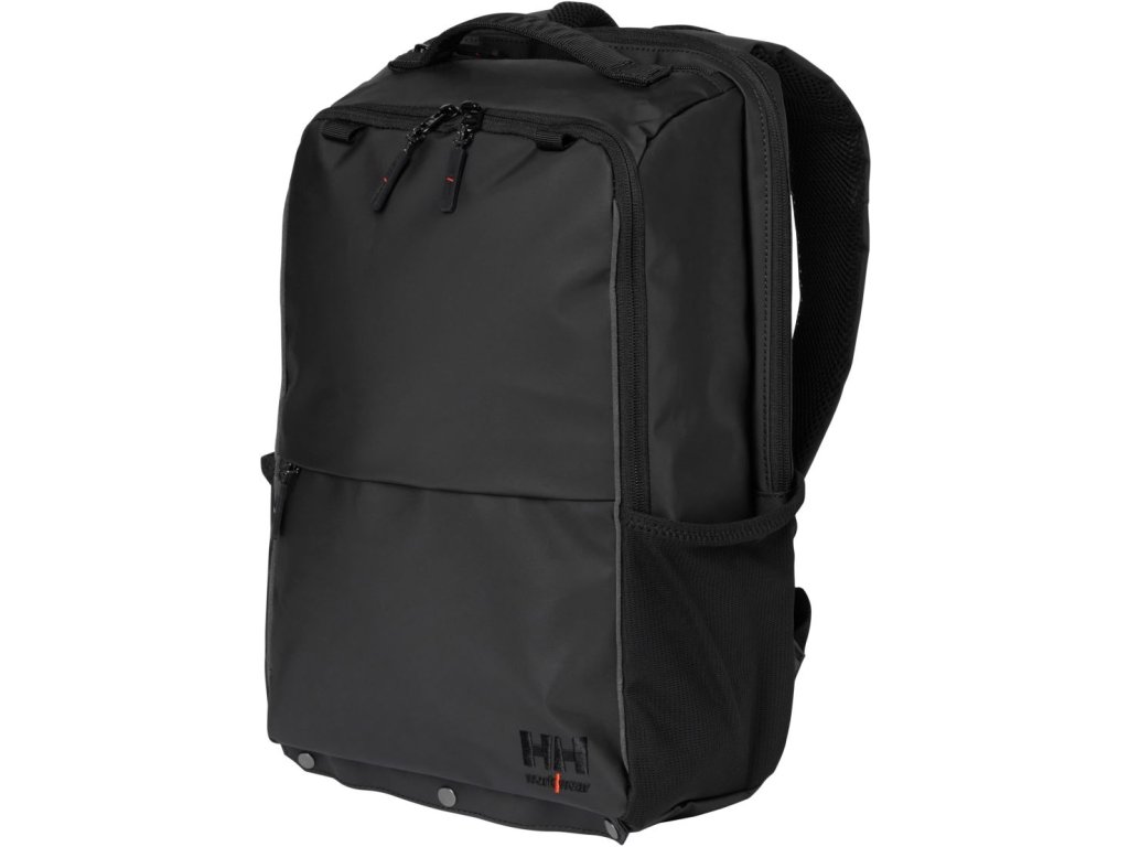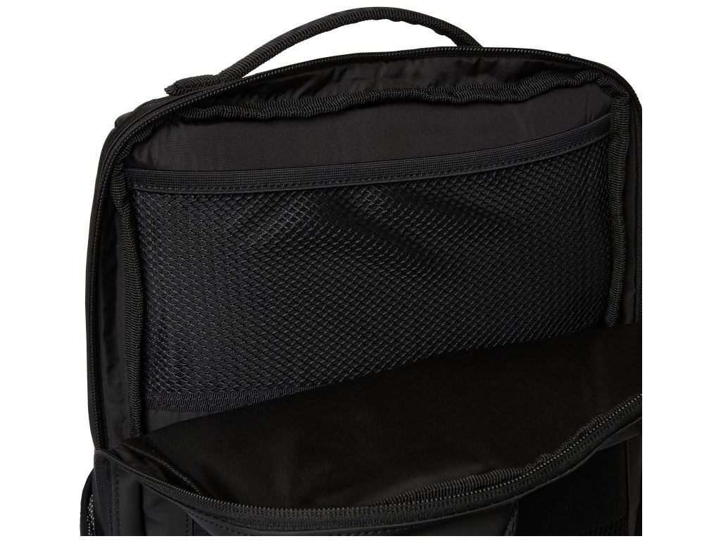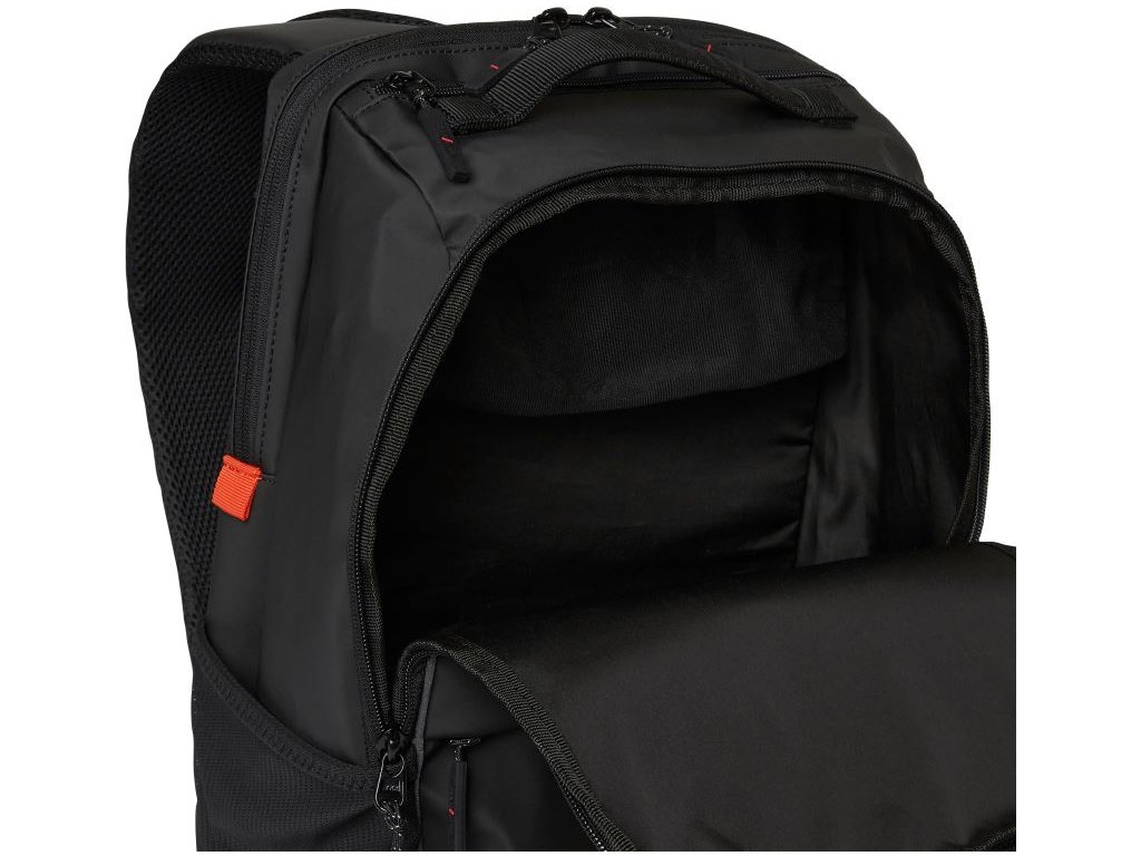 Vodeodpudivý materiál, rukoväť, nastaviteľný a polstrovaný ramenný popruh, sieťovina na chrbte a ramenných popruhoch pre lepšie vetranie a komfort, YKK zips, vrecko na doklady, elastické bočné vrecká zo sieťoviny, predné vrecko na zips, vnútri sieťované vrecko, polstrovaný obal pre laptop, vel detaily,