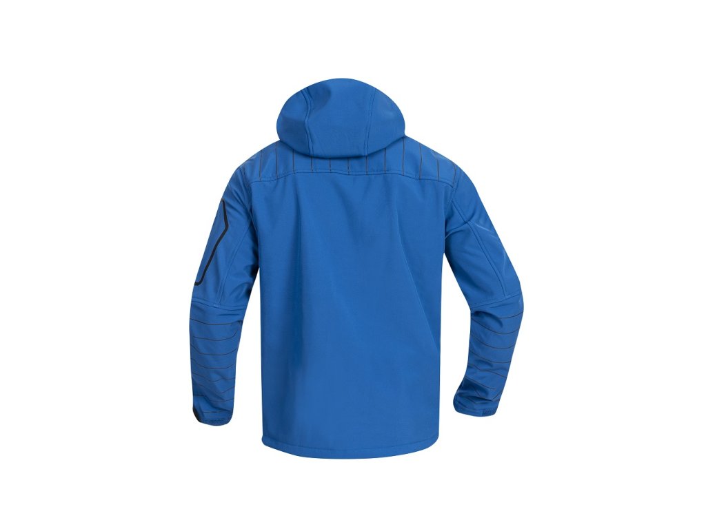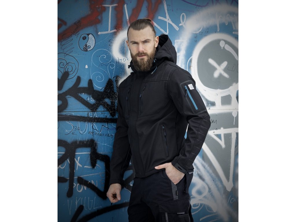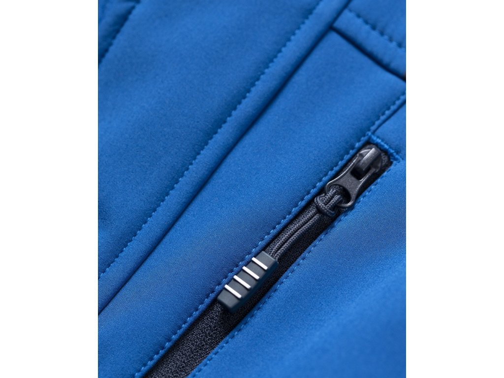 • luxusná pánska softshellová bunda s dekoratívnou potlačou na sedle a rukávoch, modré doplnky