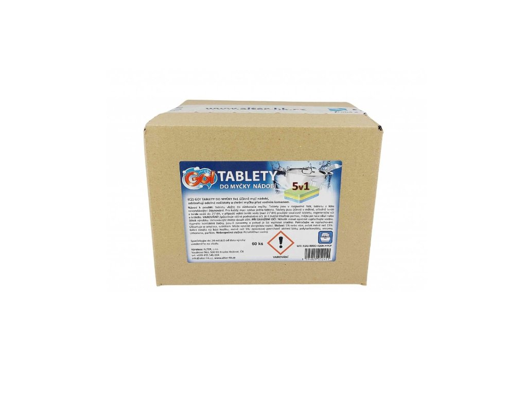 GO! TABLETY DO MYČKY 5v1 účinně myjí nádobí, odstraňují odolné nečistoty a chrání myčku před vodním kamenem.