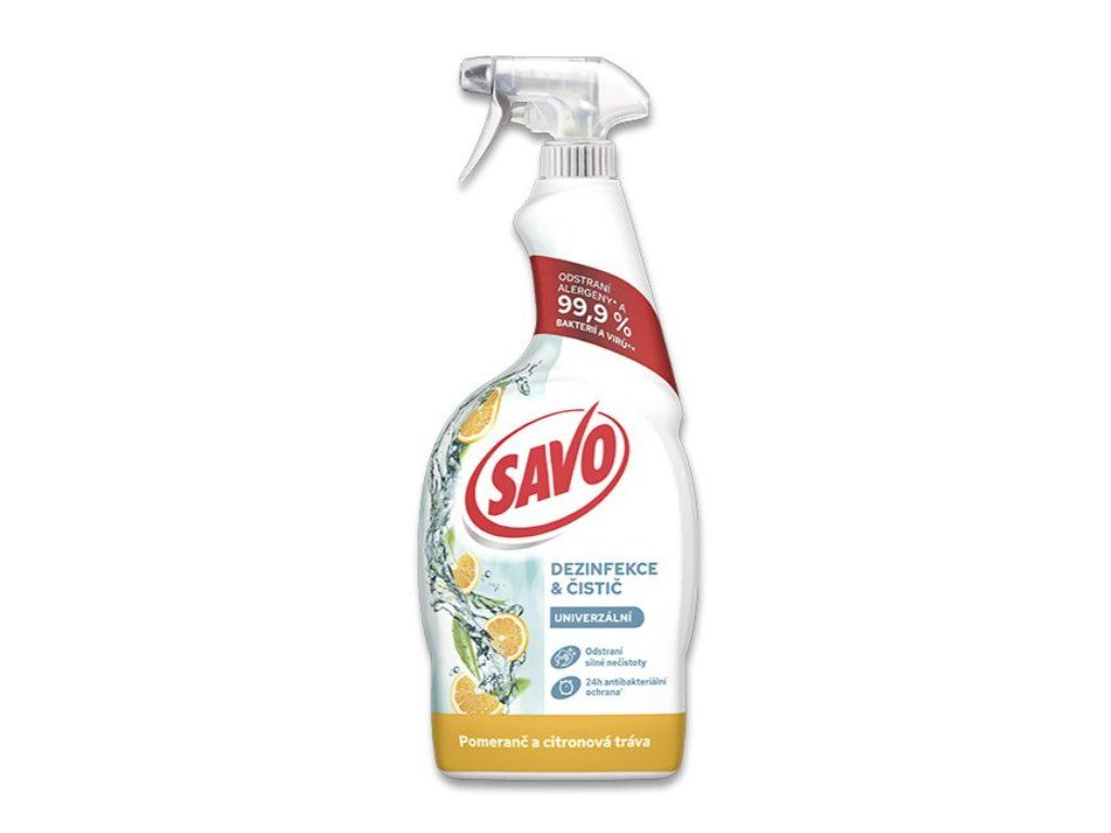 Savo Víceúčelový sprej. Tekutý čisticí a dezinfekční přípravek ve spreji bez chloru je vhodný na omyvatelné povrchy v celé domácnosti. Přípravek příjemně voní. Jeho bezoplachové složení čistí a zároveň dezinfikuje různé povrchy v koupelně a kuchyni. Přípravek je vhodný i na kovové povrchy. Zároveň pomáhá odstraňovat alergeny (způsobené prachem, pylem, přítomností psa nebo kočky).