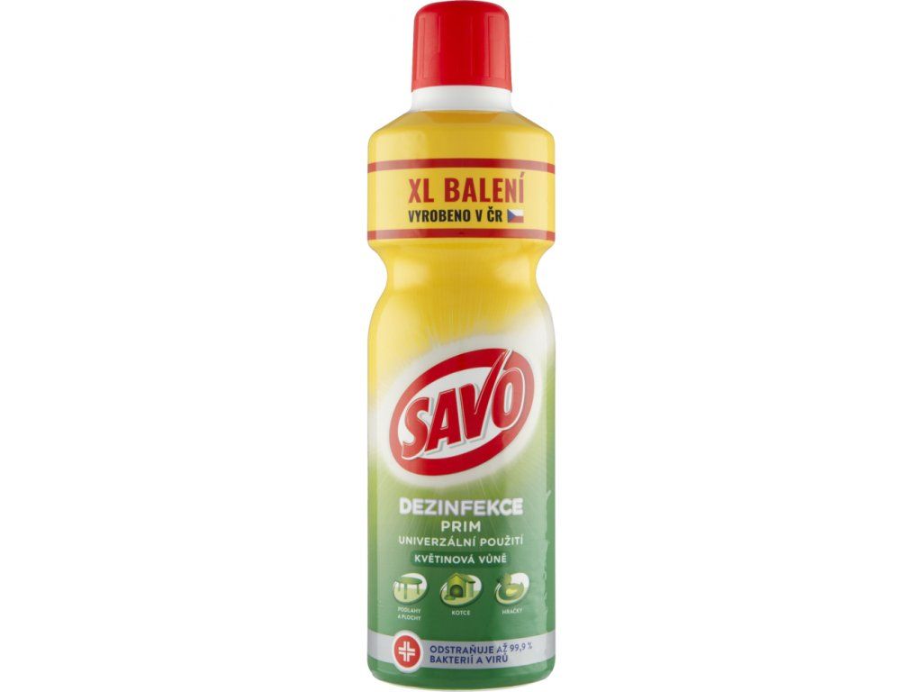 Tekutý čisticí a dezinfekční přípravek účinně vyčistí a vydezinfikuje a dodá vašemu domovu nádech svěží čistoty. Savo Prim je univerzální čistič, vhodný i do domácnosti s domácími zvířaty. Spolehlivě likviduje 99,9 % bakterií, virů, kvasinek a plísní.