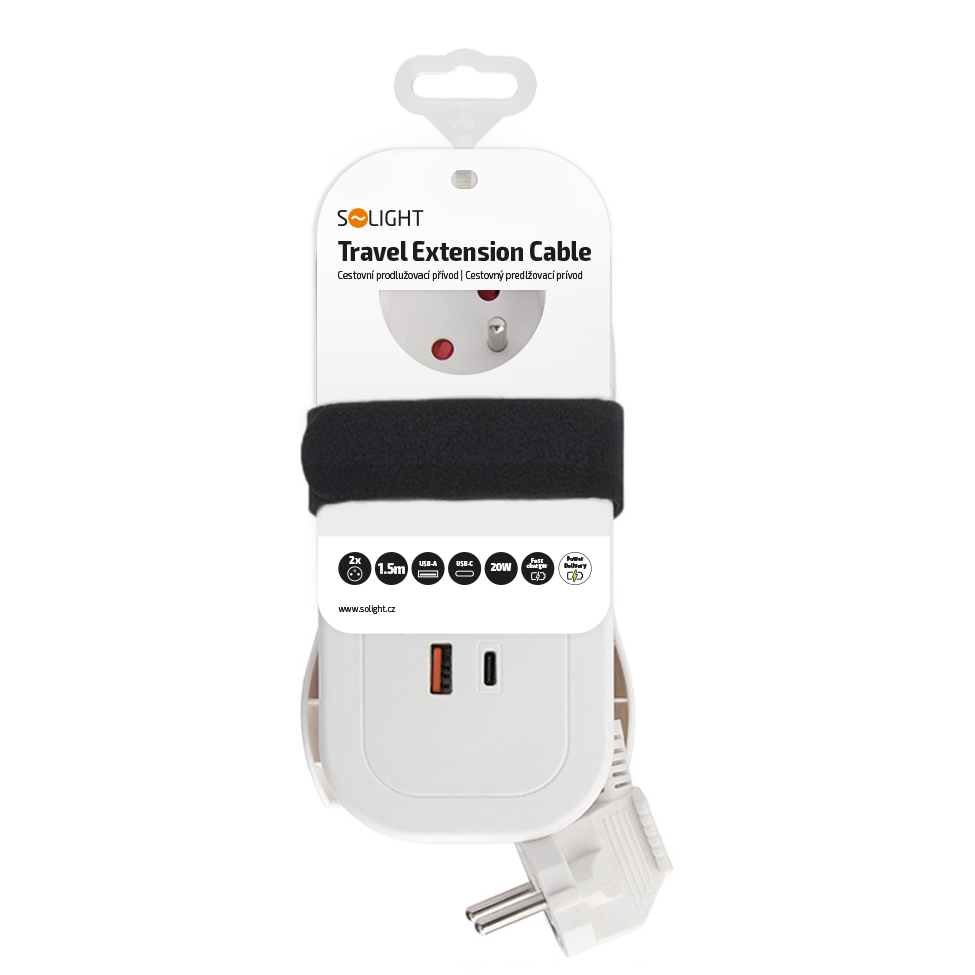 Solight 2z + USB A+C 20W PD, cestovný predlžovací prívod 1.5m, biely