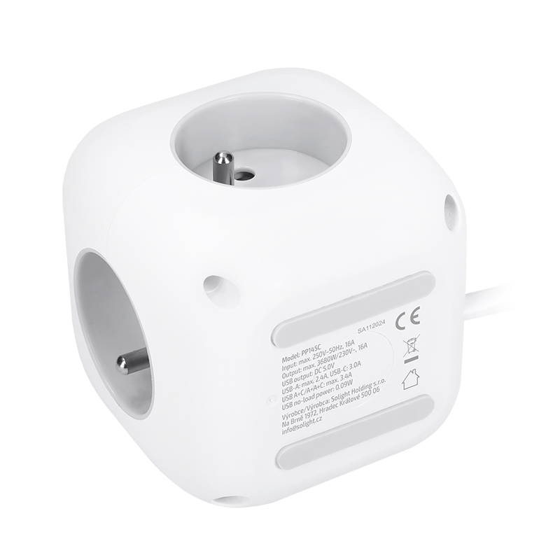 Bezpečnosť a výkon Tri štandardné 230V zásuvky s detskými poistkami poskytujú maximálnu ochranu a zvládnu záťaž až 3680 W pri 230V~/16A. Kombinácia USB-A a USB-C portov umožňuje flexibilné využitie na nabíjanie väčšiny dostupných zariadení.