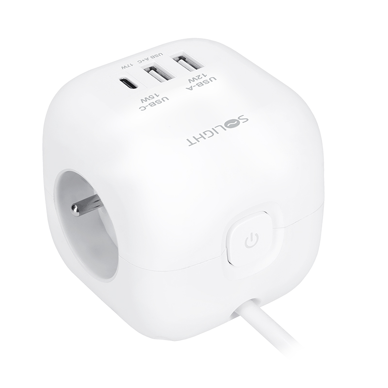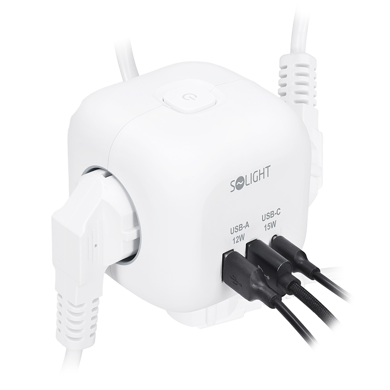 Predlžovací prívod v tvare kocky s dĺžkou strany 8 cm spája tri uzemnené zásuvky s detskou poistkou a USB nabíjačku s portami USB-C a USB-A. Vďaka 2m dlhému káblu poskytuje flexibilné využitie. Protišmykové podložky udržujú prívod stabilný na stole alebo pracovnej ploche. Podsvietený vypínač umožňuje jednoduché ovládanie všetkých zásuviek aj USB portov.
