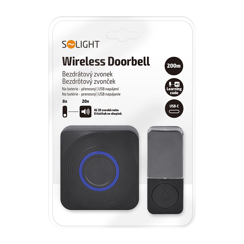 Solight bezdrôtový zvonček, batériový + USB, 200m, čierny, learning code