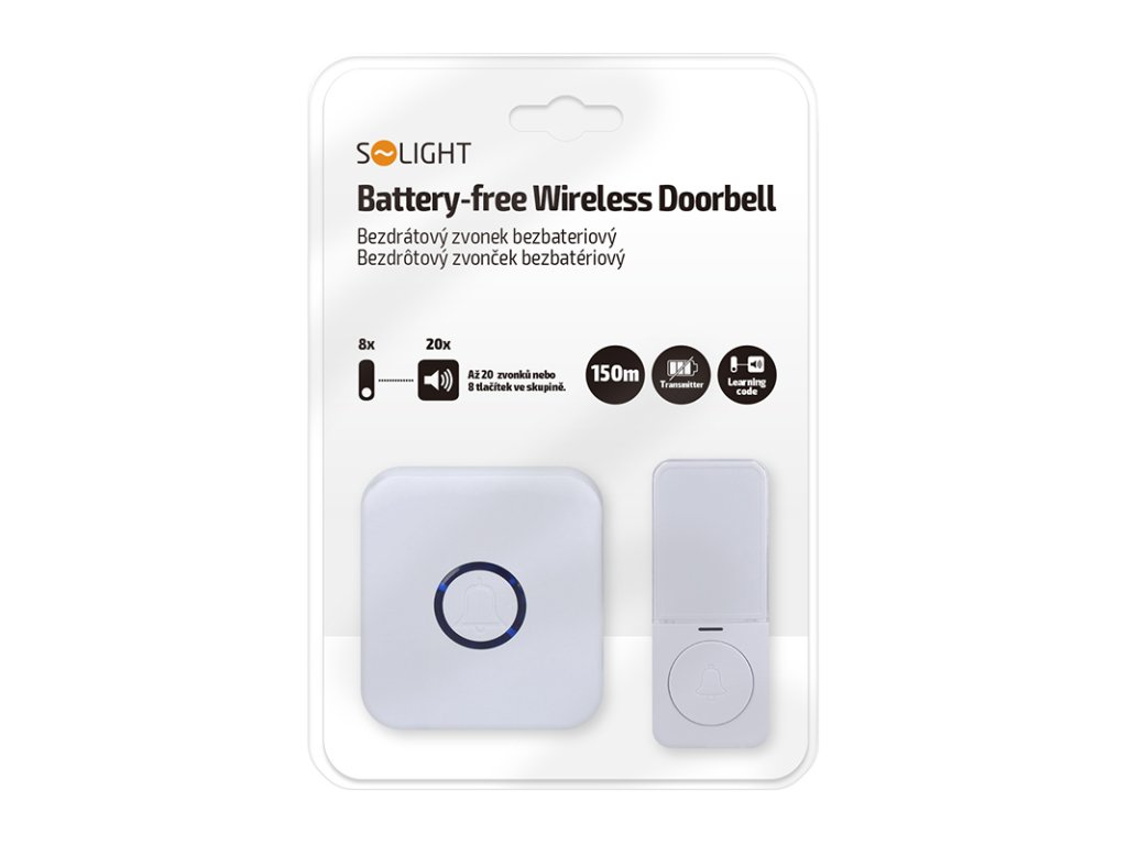 Tento bezdrôtový zvonček prináša inteligentné riešenie vďaka tlačidlu bez potreby batérií. Elektrický signál je vytváraný prevodom mechanickej energie pri stlačení - systém na princípe dynama. Odpadá tak nutnosť výmeny batérií, ktorú oceníte najmä v zimnom období alebo pri častom používaní. Prijímač stačí zapojiť do zásuvky, tlačidlo pripevniť na dvere a všetko je pripravené na prevádzku.