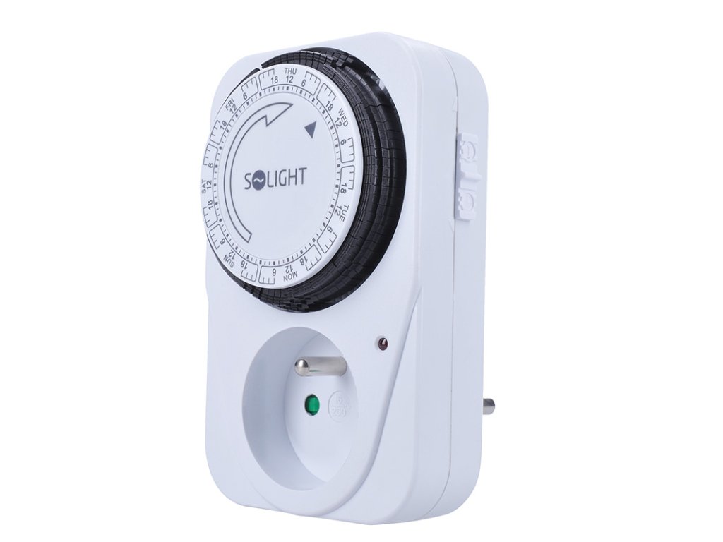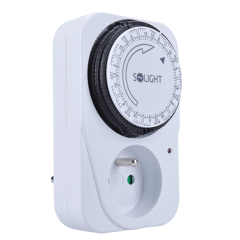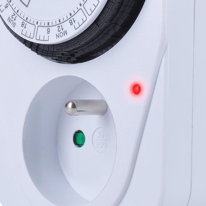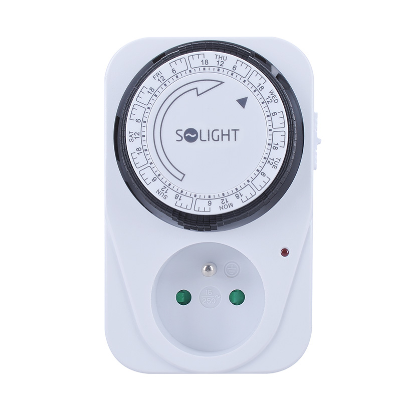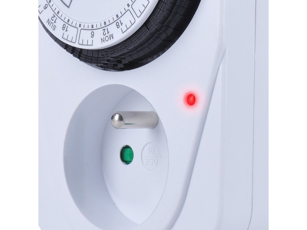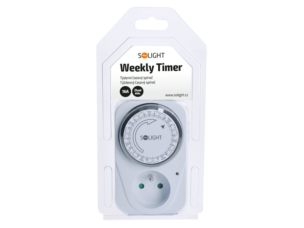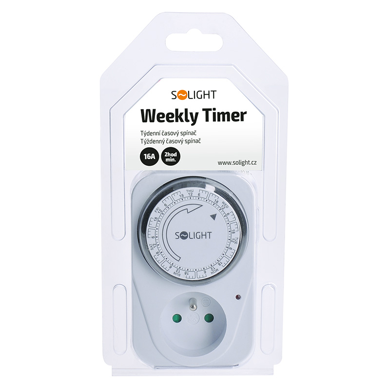 Mechanický týždenný časový spínač s minimálnym časovým úsekom 2 hodiny. Je vybavený mechanickým spínačom a detskou poistkou. Napájanie 230 V/16 A, 50 Hz. Vhodný na plánované ovládanie spotrebičov, vykurovania alebo osvetlenia.