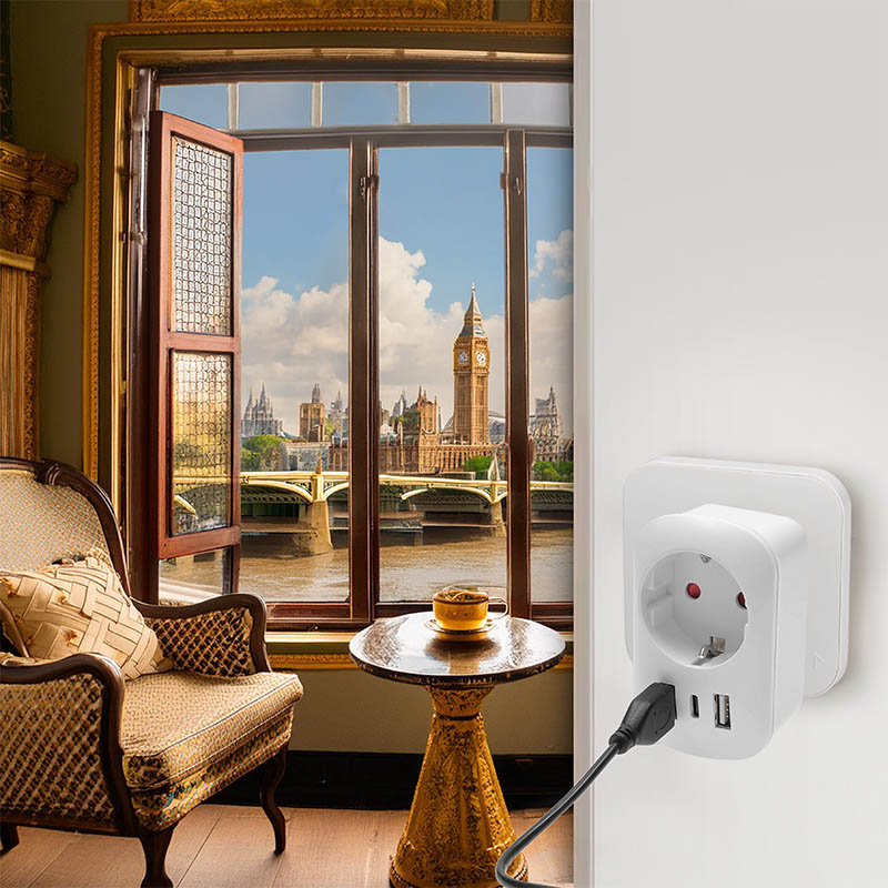 Adaptér umožňuje bezpečné použitie európskych zariadení v zásuvkách Spojeného kráľovstva a krajinách s UK štandardom. Pripojí uzemnené aj neuzemnené vidlice prívodných káblov, bez problémov zapojíte všetko od notebookov až po fény. Vstavaná USB nabíjačka nabíja telefón či tablet bez nutnosti odpájať prívodnú šnúru z hlavnej zásuvky.