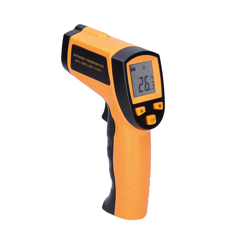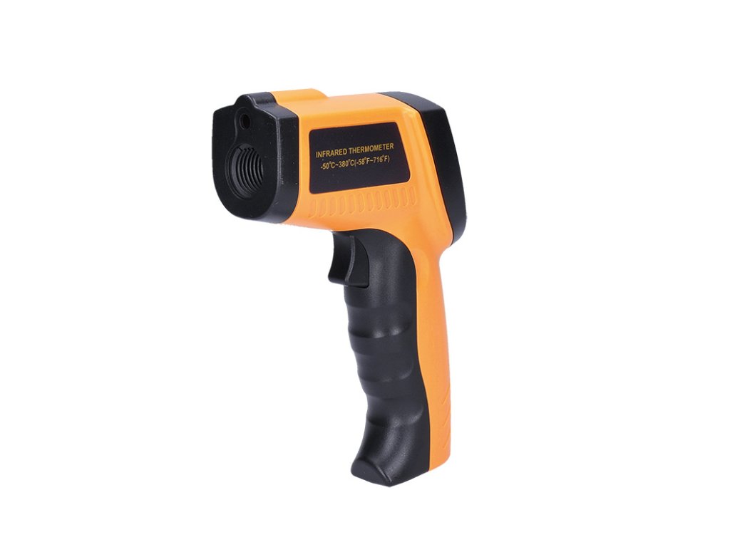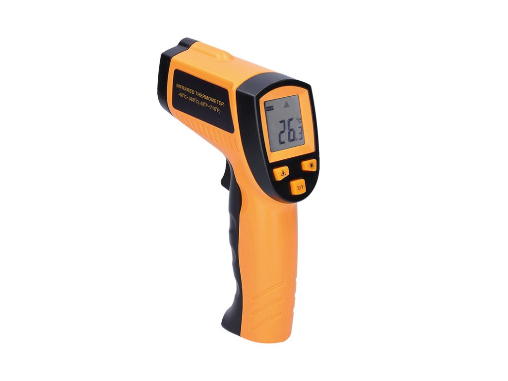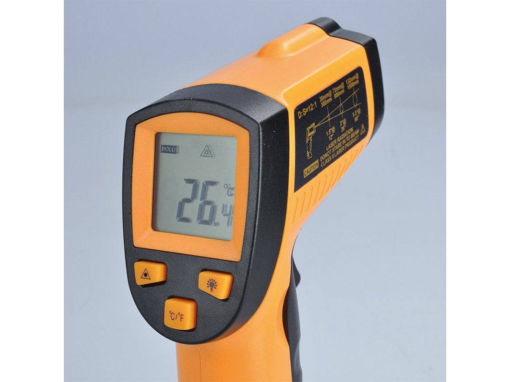 Infračervený teplomer na meranie teploty bez priameho kontaktu s meraným objektom. Rozsah merania teploty: -50 °C až +380 °C s presnosťou +/- 1,5 °C. Laserový zameriavač a podsvietený displej na jednoduché odčítanie výsledkov, možnosť prepínania medzi °C/°F. Optický pomer 12:1, spektrum vlnových dĺžok 8-14 µm a čas merania 500 ms. Pamäť na posledné čítanie, automatické vypnutie po 8 s bez aktivity a indikácia slabej batérie. Napájanie: 9V batéria (súčasť dodávky). Ideálne na rýchle a presné meranie teploty.