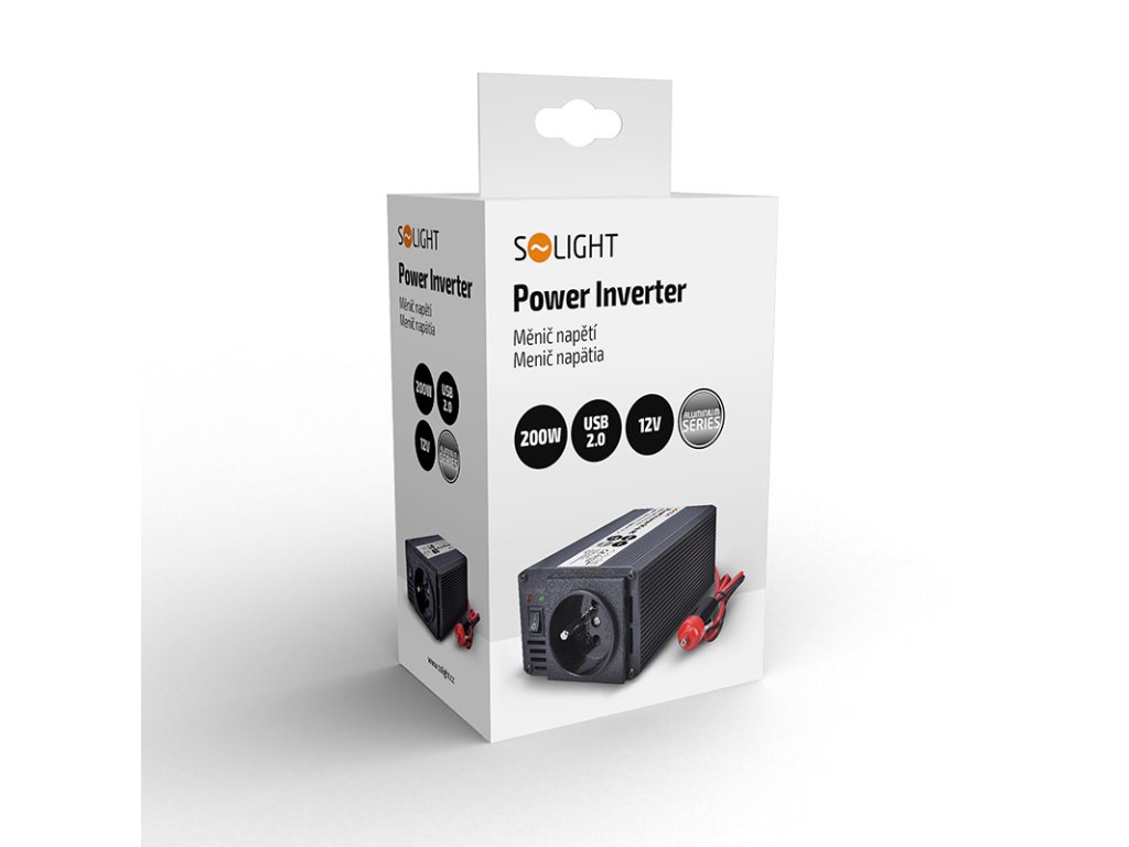 Solight invertor 12V, USB 500mA, kovový, čierny, max. zaťaženie: 200W
