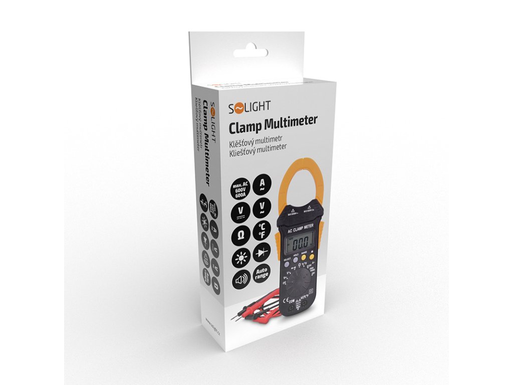 Solight kliešťový multimeter, max. AC 600V/600A, max. DC 600V, test diódy, bzučiak, odpor, teplota