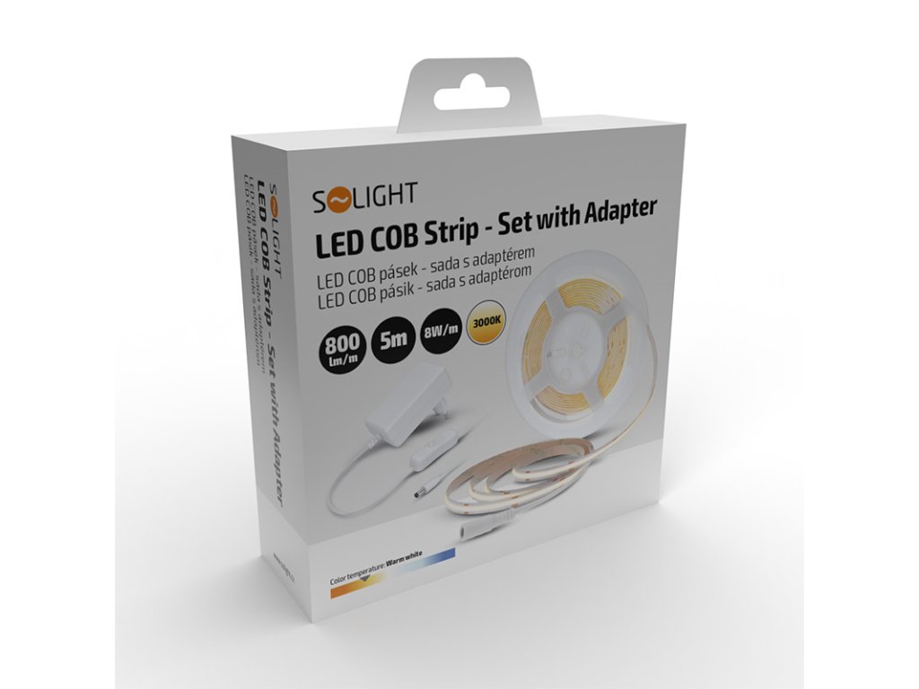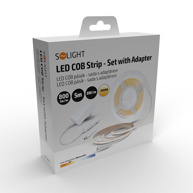 Solight LED COB pásik, sada s adaptérom, vypínač, 5m, 8W/m, 800lm/m, teplá biela