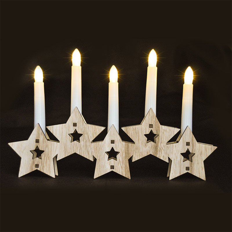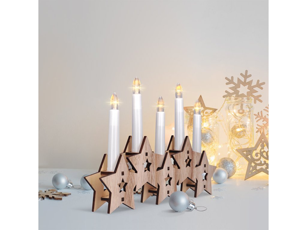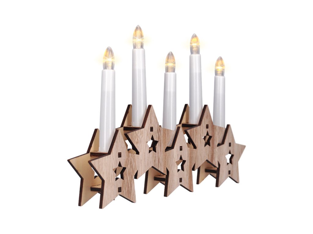 Drevený svietnik s piatimi sviečkami a LED diódami v teplej bielej farbe je štýlovou reinterpretáciou klasického adventného svietnika. Je vyrobený z prírodného dreva a spája tradičný vzhľad s modernou technológiou. Dekor hviezdičiek dodáva svietniku šmrnc a zároveň jemnú eleganciu. Vďaka rozmerom 30 × 20 × 3,5 cm je dominantnou ozdobou na parapete alebo komode.