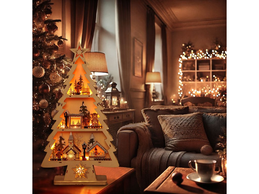 - drevený vianočný stromekček s dekoráciami a LED osvetlením