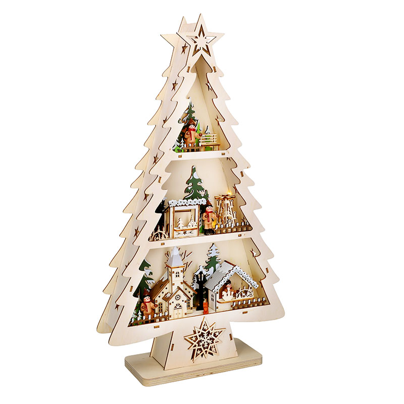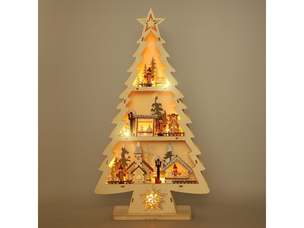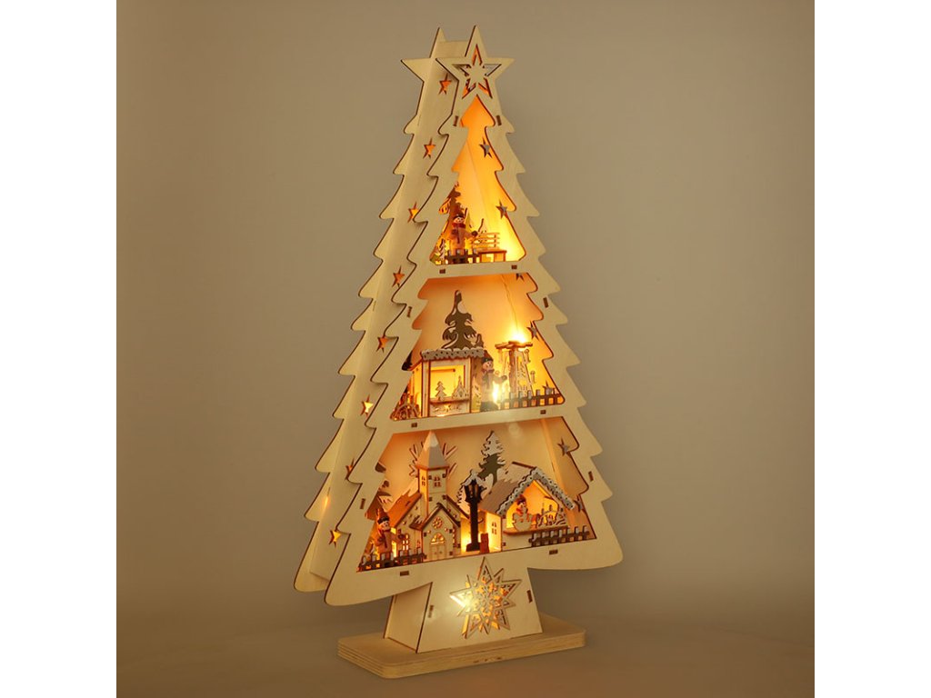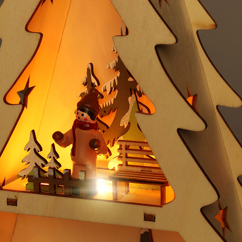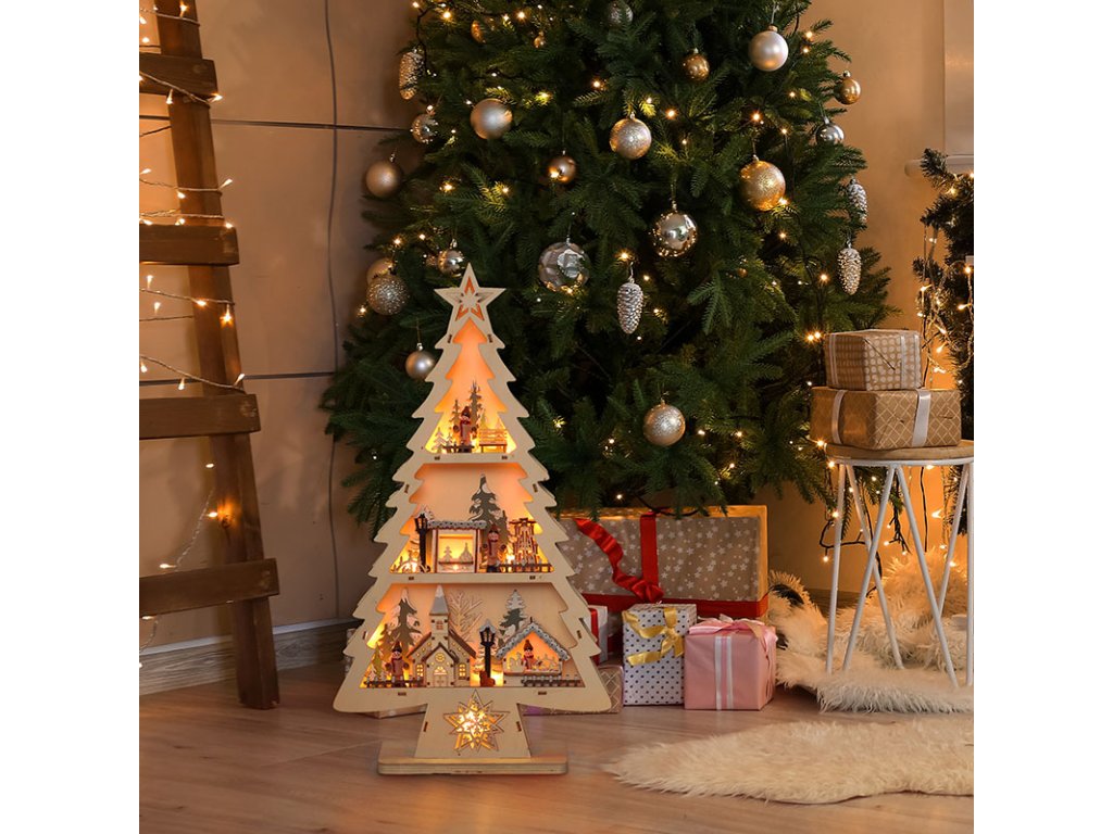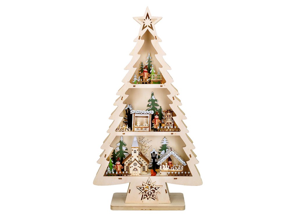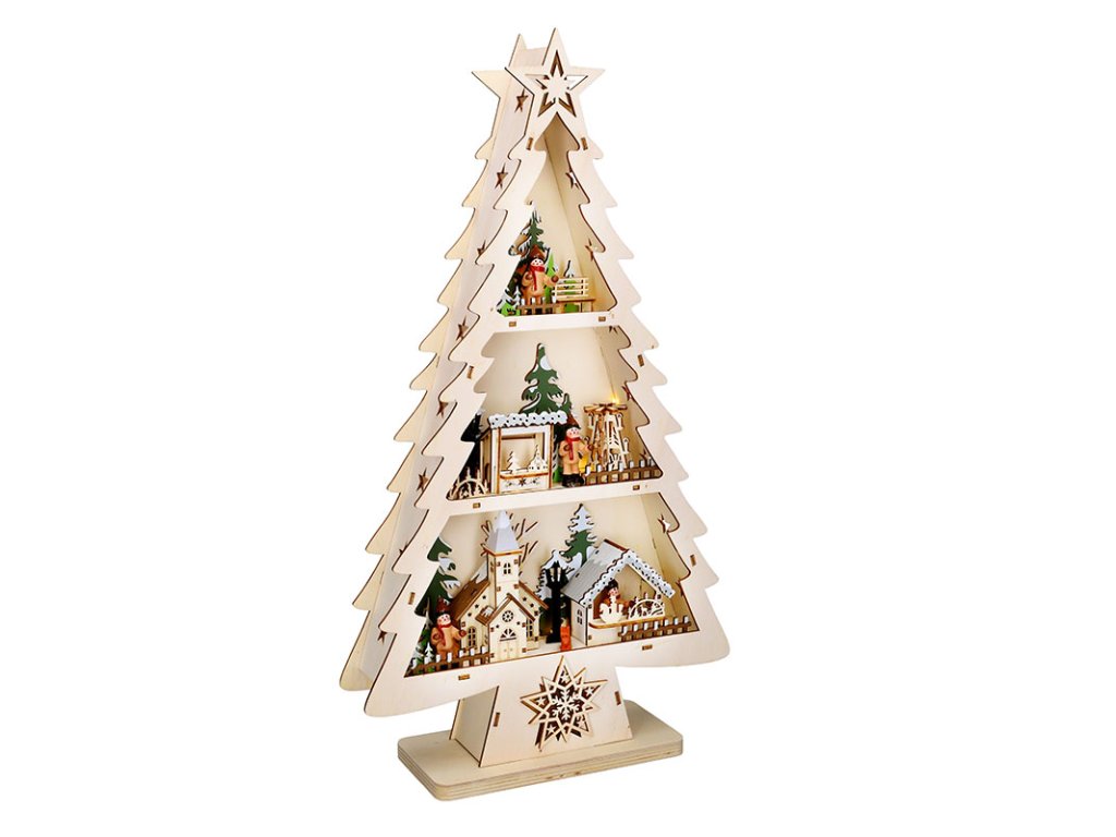 Menšia verzia obľúbeného dreveného stromčeka je 53 cm vysoká a 30 cm široká. Je vybavený 13 LED diódami, ktoré svietia teplým bielym svetlom a osvetľujú drobné farebné ozdoby rozmiestnené po celej ploche. Farebné prvky v kombinácii s prírodným podstavcom pôsobia hravo a veselo, ideálne do detskej izby alebo ako doplnok k tradičným dekoráciám.