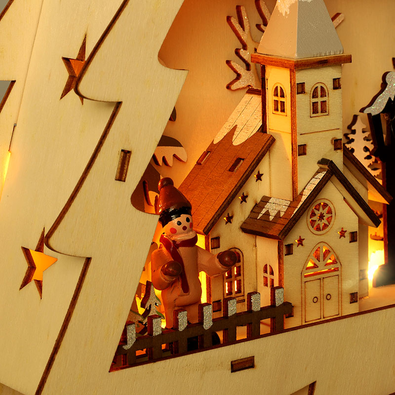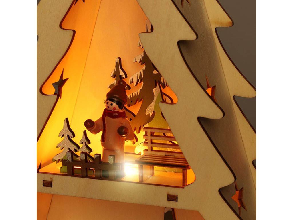 Napájanie zabezpečujú 2x batérie AA (nie sú súčasťou balenia) s výdržou približne 100 hodín. Pohodlnú prevádzku zabezpečuje možnosť zapnutia/vypnutia alebo použitie časovača 6h/18h. Vyrobené z masívneho dreva, vhodné na použitie v interiéri (IP20). Vynikajúca ako samostatná dekorácia alebo ako doplnok väčšej vianočnej scény.