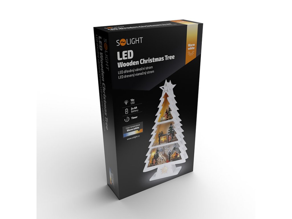 Solight LED drevený vianočný stromek s dekoráciami, 13x LED, prírodné drevo, 53cm, 2x AA