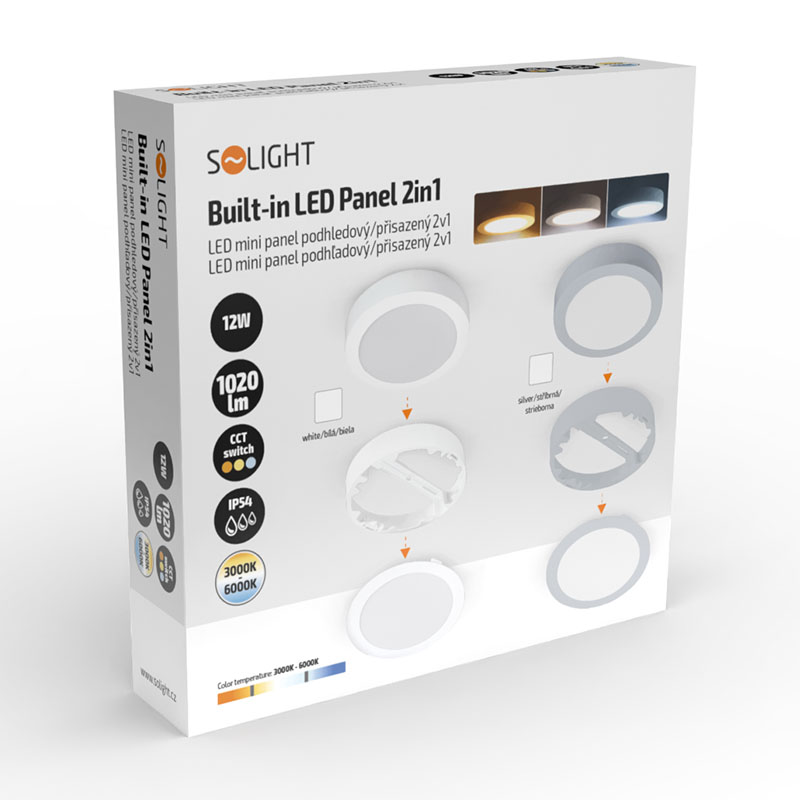 Solight LED mini panel kúpeľňový 2v1, 3CCT, podhľadový / prisadený, 12W, 1020lm, IP54, biela, okrúhly