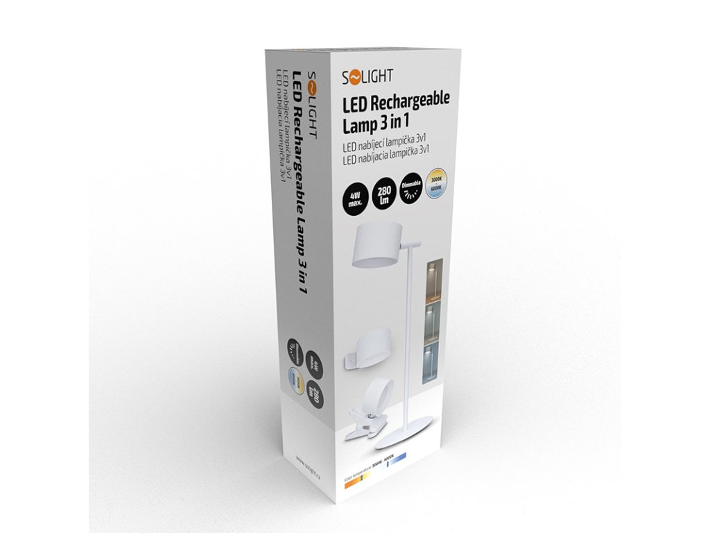 Kompaktná a prenosná LED lampa 3v1 so zabudovanou batériou ponúka umiestnenie na stolový stojan, klip a nástenný držiak - všetko je súčasťou balenia. Poskytuje tri teploty svetla (3000K/4000K/6500K) a tri úrovne jasu, ktoré sa ovládajú dotykom. Ideálna na čítanie a prácu bez pripojenia k elektrickej sieti.