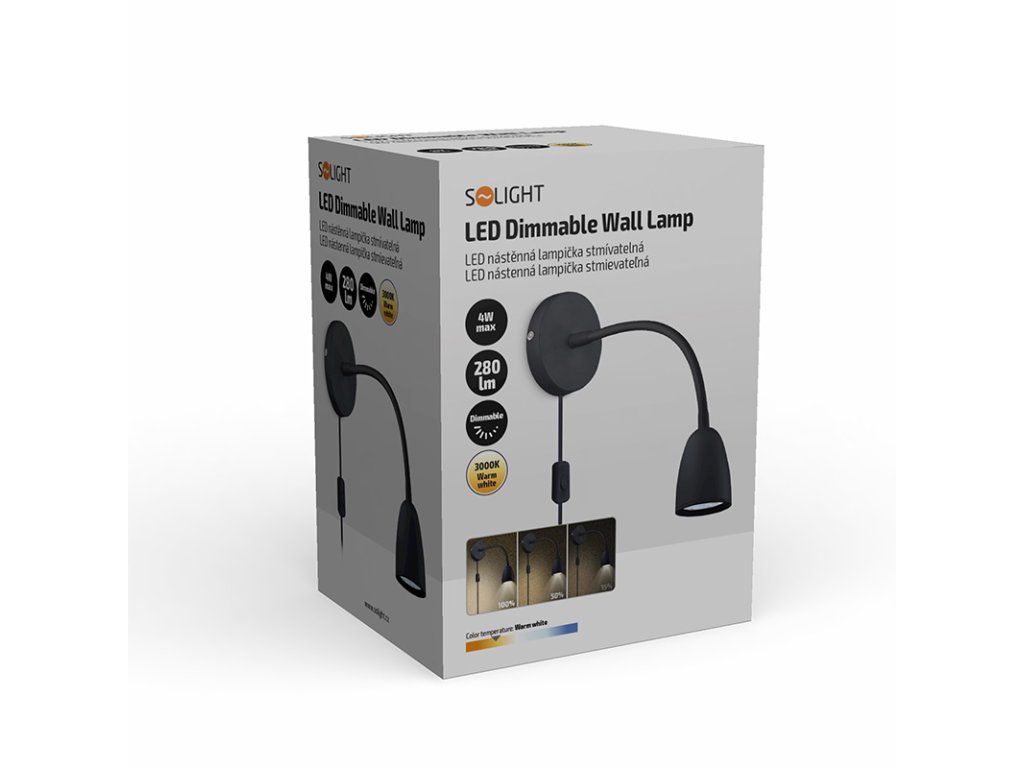 Solight LED nástenná lampička, stmievateľná, 4W, 280lm, 3000K, čierna