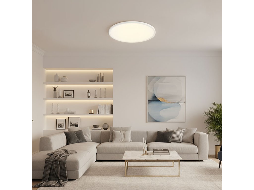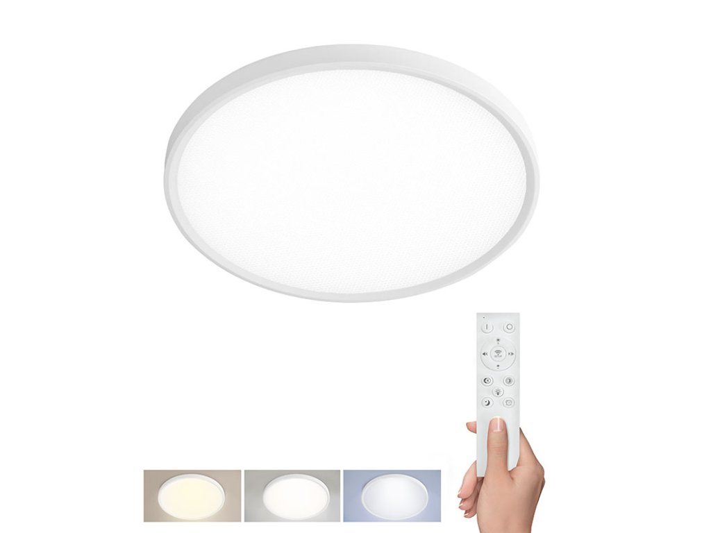 Výkonný LED stropné osvetlenie s maximálnym svetelným tokom až 5400 lm a príkonom 50W poskytuje silné, rovnomerné a komfortné osvetlenie pre väčšie obytné aj komerčné priestory. Vďaka možnosti plynulého stmievania a voľby teploty svetla v rozsahu 3000K až 6600K (od teplej po studenú bielu) sa perfektne prispôsobí rôznym denným situáciám – od relaxácie až po sústredenú prácu. Diaľkové ovládanie umožňuje jednoduchú reguláciu jasu, výber z prednastavených režimov svietenia a pohodlné ovládanie bez vstávania.