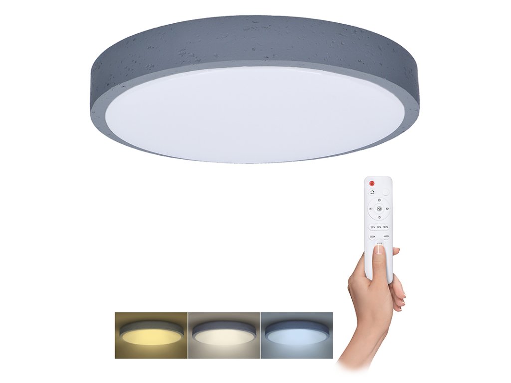 Veľkoformátové stmievateľné LED svietidlo Grey s príkonom až 60 W a svetelným tokom 4200 lm (pre 4000K) zaujme nielen svojím výkonom, ale aj dizajnom v imitácii sivého betónu. Ponúka možnosť zmeny teploty chromatickosti (3000K-6500K) a plynulé stmievanie pomocou priloženého diaľkového ovládania. Vďaka širokému uhlu osvetlenia 120° poskytuje rovnomerné a intenzívne osvetlenie veľkých priestorov.