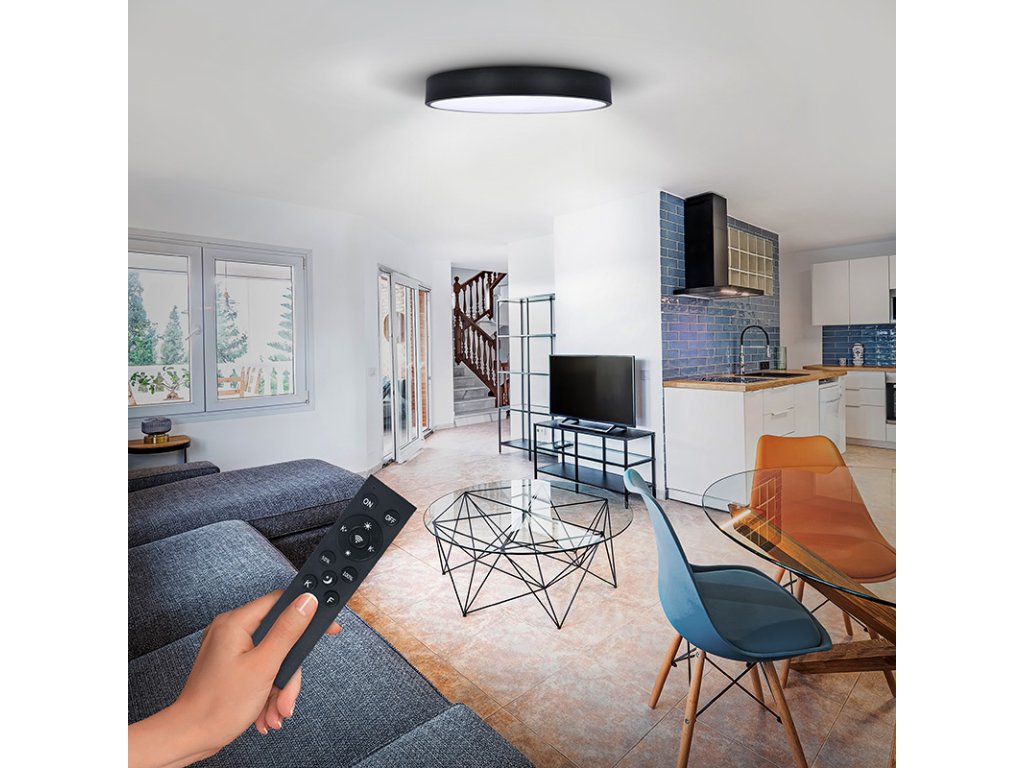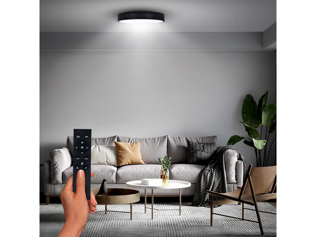 Dizajnové čierne stmievateľné svietidlo LED prináša dokonalú rovnováhu medzi funkčnosťou, výkonom a moderným vzhľadom. Svetlo možno jednoducho ovládať pomocou diaľkového ovládania, ktoré umožňuje plynulé stmievanie a zmenu teploty svetla od 3000 K do 6000 K. Maximálny príkon je 36 W a svetelný tok dosahuje až 2300 lm pri nastavení 4000K, čo poskytuje dostatočné osvetlenie pre akýkoľvek interiérový priestor.