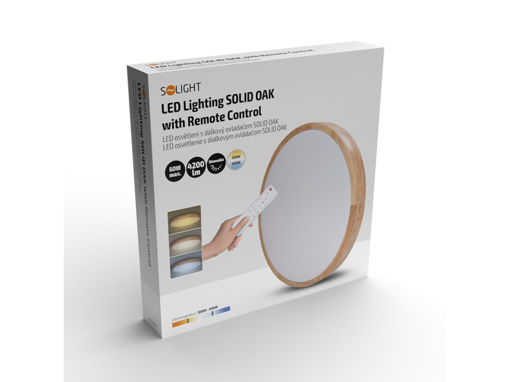 Solid Oak vo verzii 60 W je určený pre tých, ktorí potrebujú silnejší svetelný výkon - až 4200 lm pri neutrálnej bielej (4000 K). Teplotu svetla možno prepínať medzi 3000 K, 4000 K a 6500 K a svetlo možno plynule stmievať podľa nálady alebo dennej doby. Ovládanie zabezpečuje priložený diaľkový ovládač.