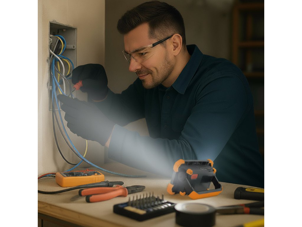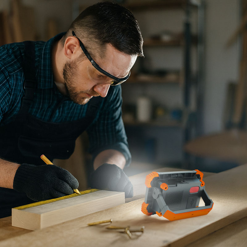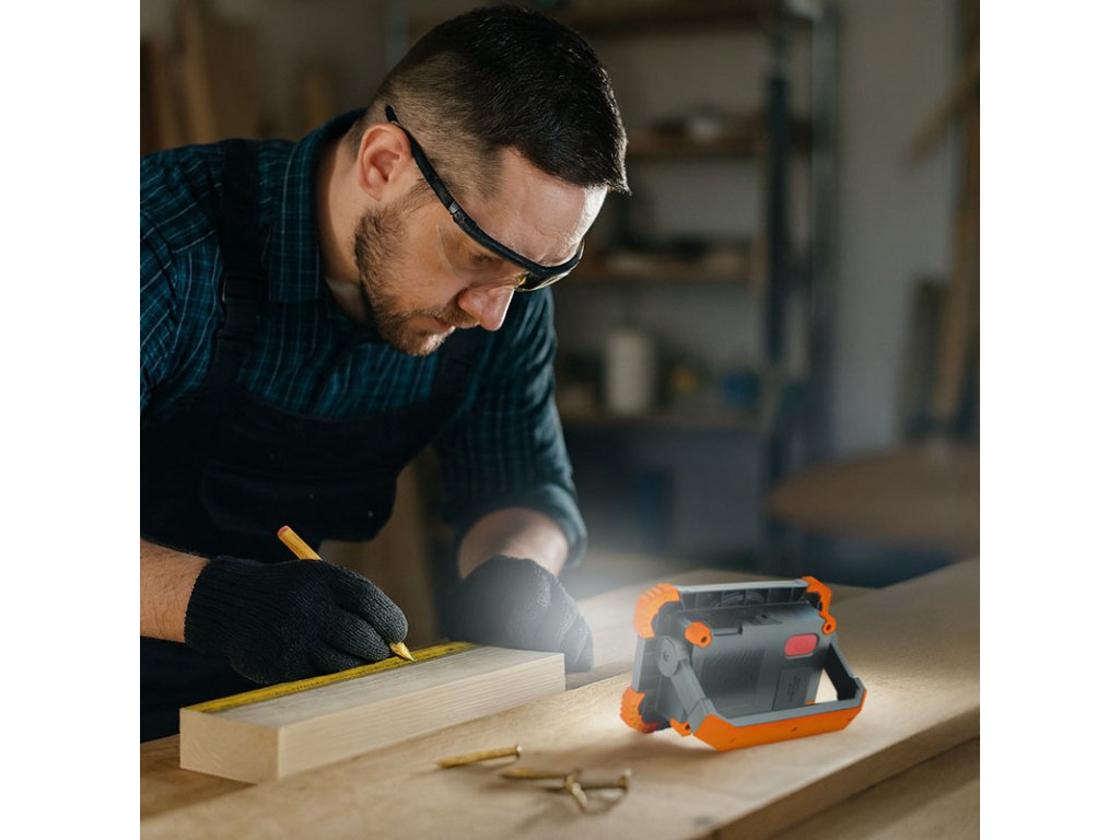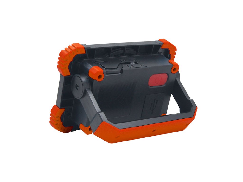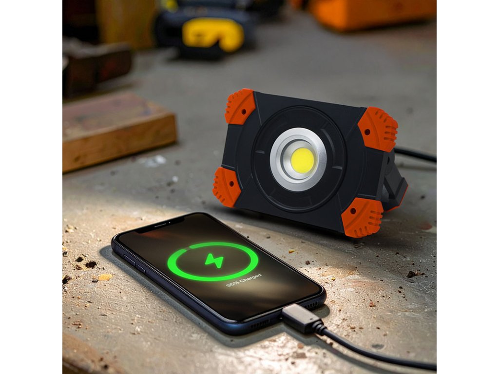 Dobíjanie batérie prebieha cez moderný USB-C konektor a trvá približne 4 hodiny. Reflektor má stupeň krytia IP54, takže je chránený proti striekajúcej vode a prachu, čo ho predurčuje na vonkajšie použitie. Svetelný kužeľ o šírke 120° zaistí dostatočné pokrytie plochy. Odolné telo z ABS a PC plastu v kombinácii s kompaktnými rozmermi (14 × 10 × 4,5 cm) a farebným prevedením v oranžovo-čiernej farbe robí z tohto modelu ideálnu voľbu pre kempovanie, opravy aj núdzové situácie.