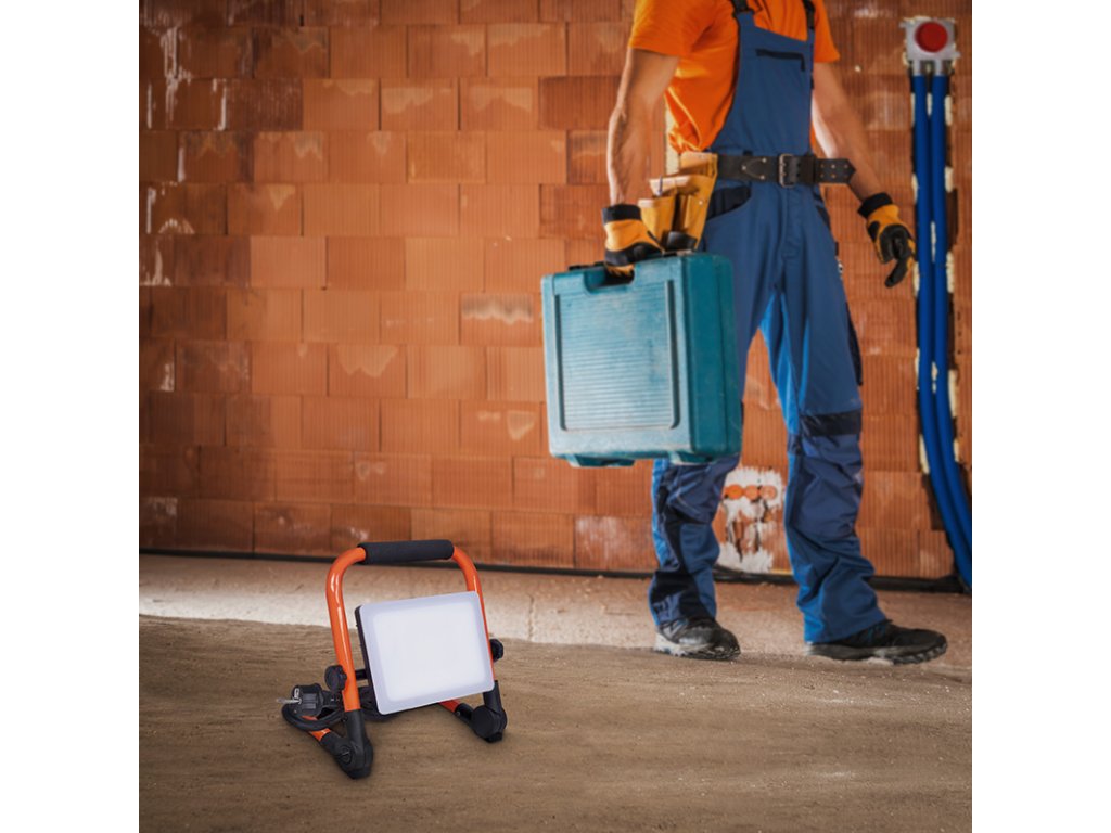 Napájanie je riešené klasickým 230V napájaním s 1,5 m dlhým káblom. Reflektor má kompaktné rozmery 230 x 60 x 260 mm a čierno-oranžový dizajn, ktorý zvyšuje jeho viditeľnosť na pracovisku. Energetická trieda F a CRI > 80 potvrdzujú vynikajúcu účinnosť a verné podanie farieb.