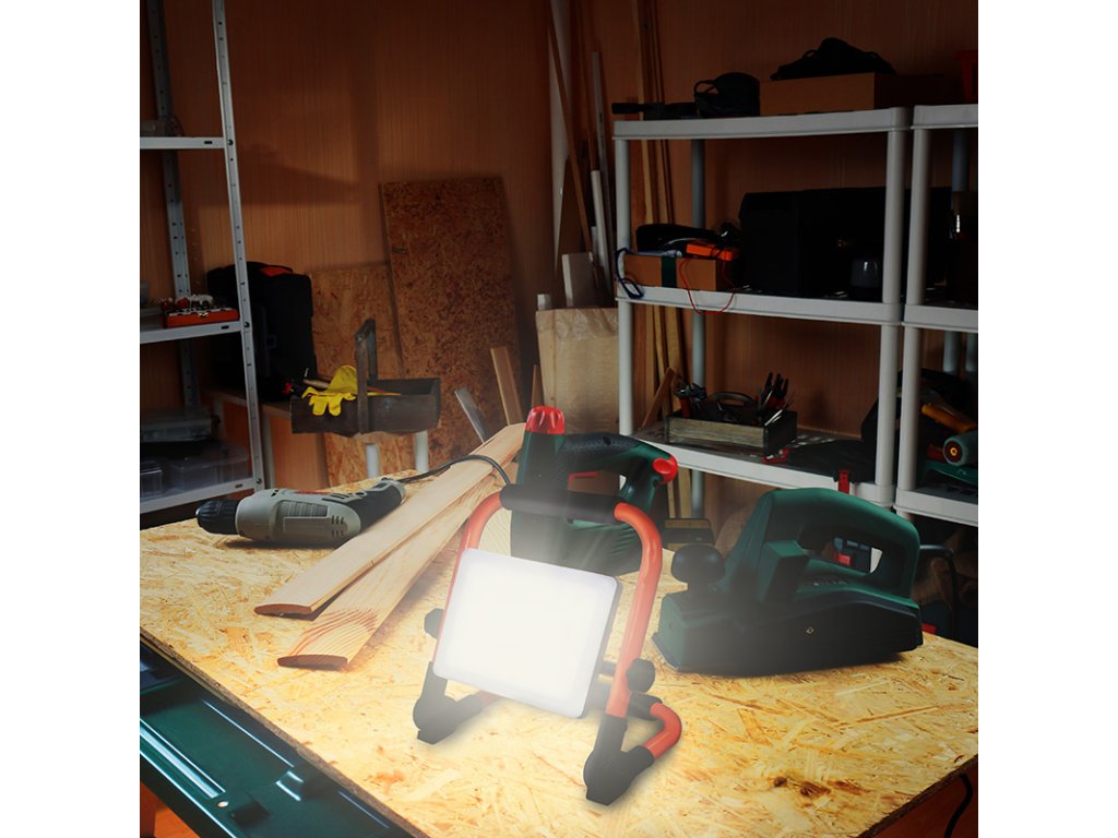 Výkonný reflektor LED s praktickým sklopným stojanom je ideálnou voľbou na osvetlenie pracovných plôch vo vnútorných aj vonkajších podmienkach. S výkonom 30 W a svetelným tokom 2700 lúmenov poskytuje intenzívne a rovnomerné svetlo v neutrálnej bielej farbe (4000 K), ktoré neunavuje oči a umožňuje presnú prácu.