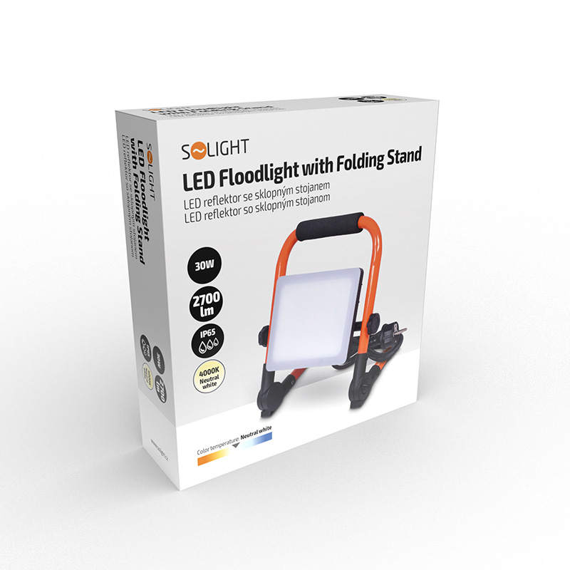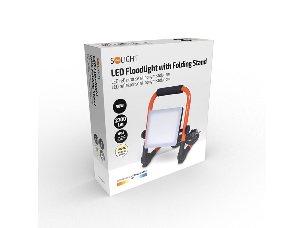 Solight LED reflektor so sklopným stojanom, 30W, 2700lm, 4000K, kábel so zástrčkou, IP65