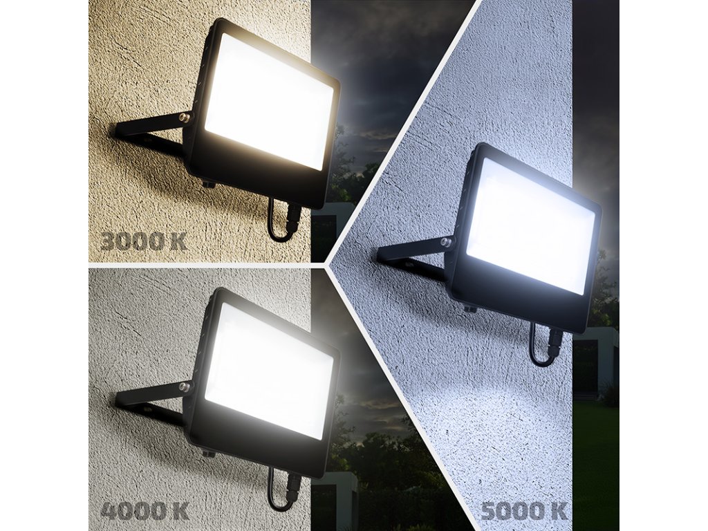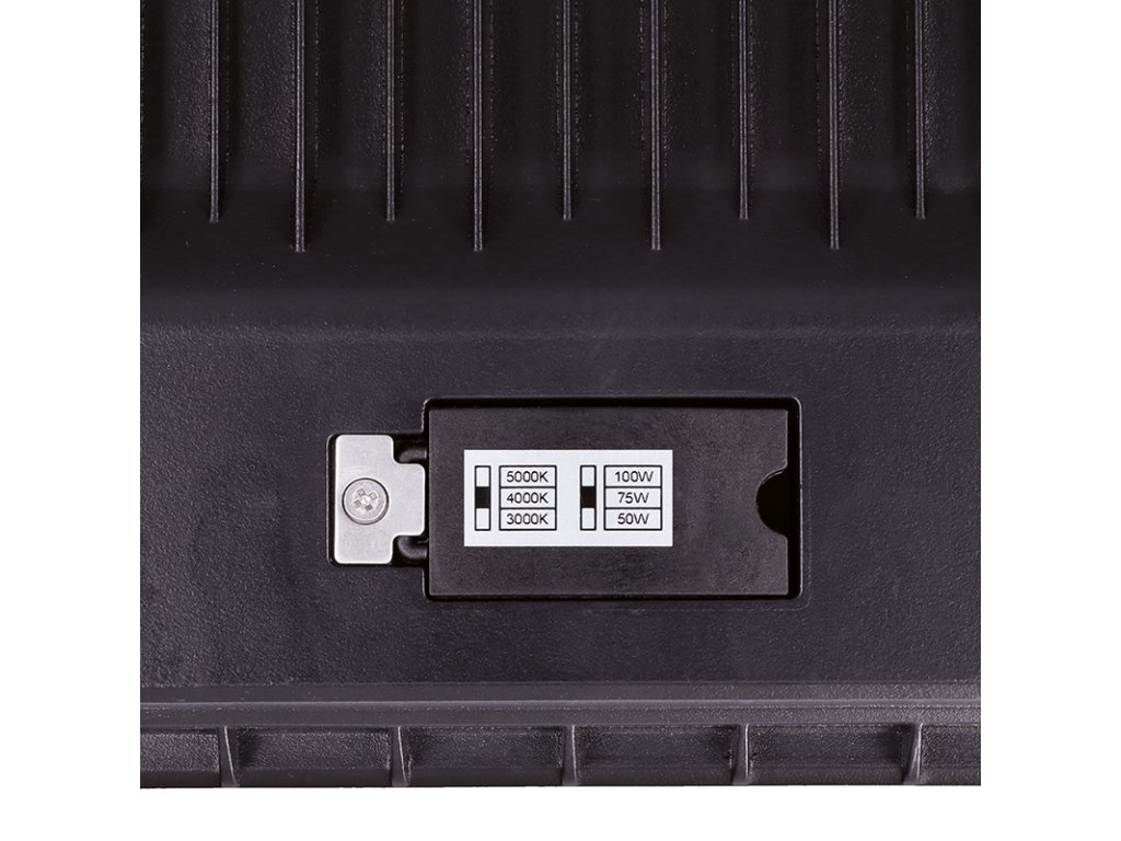 LED reflektor radu TOP s výkonom až 100W a svetelným tokom 14 000 lm je navrhnutý pre náročné aplikácie, kde je potrebná vysoká intenzita svetla. Pomocou prepínača si môžete zvoliť aj úspornejšie režimy na 75W (10 500 lm) alebo 50W (7000 lm), a to bez nutnosti výmeny zariadenia. Možnosť prepínať medzi teplotami svetla 3000/4000/5000 (teplá, neutrálna, studená) prináša maximálne prispôsobenie aktuálnym podmienkam. Svetelný kužeľ so šírkou 120° zaisťuje rovnomerné pokrytie plochy. Reflektor má dlhú životnosť LED čipov až 25 000 hodín, rozmery 280 × 207 × 30 mm a čierny matný povrch, ktorý sa ľahko integruje do každého priestoru. Je vhodný na osvetlenie hál, priemyselných objektov i stavebných priestorov.
