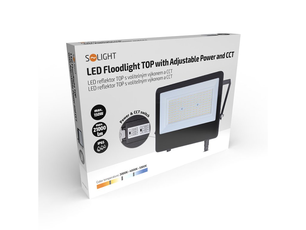 Najvýkonnejší model z radu TOP reflektorov ponúka masívny svetelný výkon až 21 000 lm pri plných 150W, čo ho robí ideálnym pre nasvietenie veľkých areálov, športovísk alebo priemyselných zón. Vďaka prepínateľnému výkonu je možné reflektor nastaviť aj na 110W (15 400 lm) alebo 70W (9 800 lm), čím je možné optimalizovať spotrebu elektrickej energie. Možnosť zmeny teploty svetla v rozsahu 3000K–5000K pridáva na univerzálnosti zariadenia.