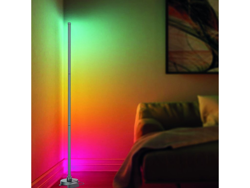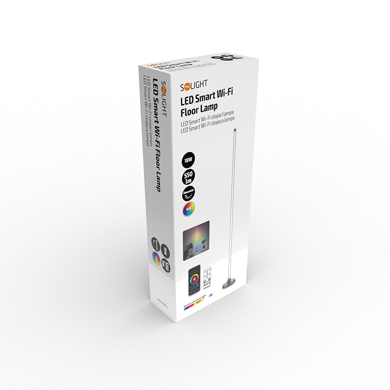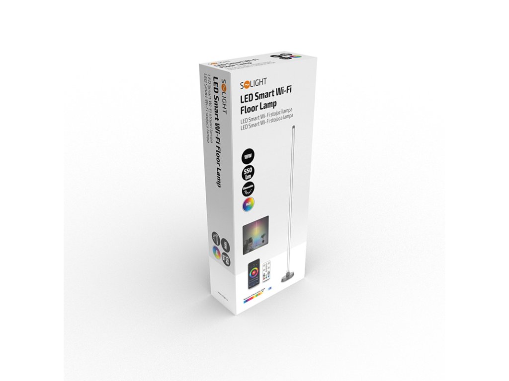 - LED SMART WIFI stojaca lampa je ovládaná chytrým telefónom. Podporuje Wifi 2,4GHz, Androidd 4.1 a vyššie a IOS 8.0 a vyššie. Umožňuje nastavovať rôzne režimy svietenia, farby (RGB) a intenzitu svetla. LED pásik možno ovládať aj diaľkovým ovládačom, ktorý je súčasťou balenia.