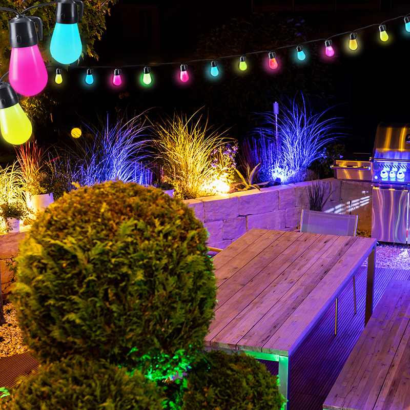 Solight LED smart vonkajšia reťaz s RGB žiarovkami, bluetooth, 15 žiaroviek, 14m+6m, 10W