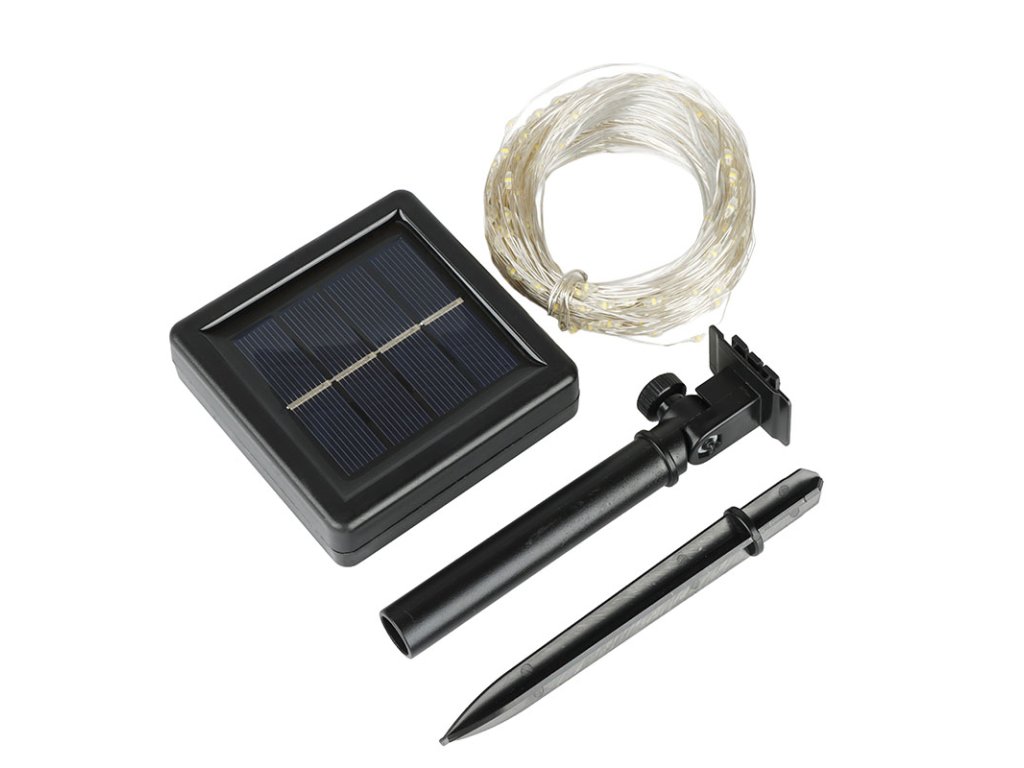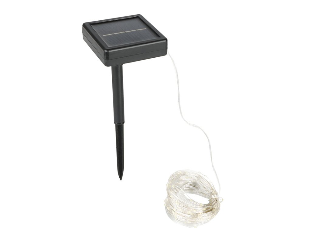 Reťaz je napájaná Li-Ion batériou (3,7V, 800mAh), ktorá sa počas dňa dobíja pomocou solárneho panelu. Doba nabíjania je približne 9 hodín v závislosti od svetelných podmienok. Automatická aktivácia senzora nastáva pri osvetlení nižšom ako 10 lux, čo zaručuje jeho spoľahlivú funkciu aj pri slabom dennom svetle. Reťaz je chránená krytím IP44, čo ho robí odolným proti vlhkosti a vhodným na vonkajšie použitie. Čierne prevedenie štýlovo ladí s rôznymi exteriérmi aj dekoráciami.