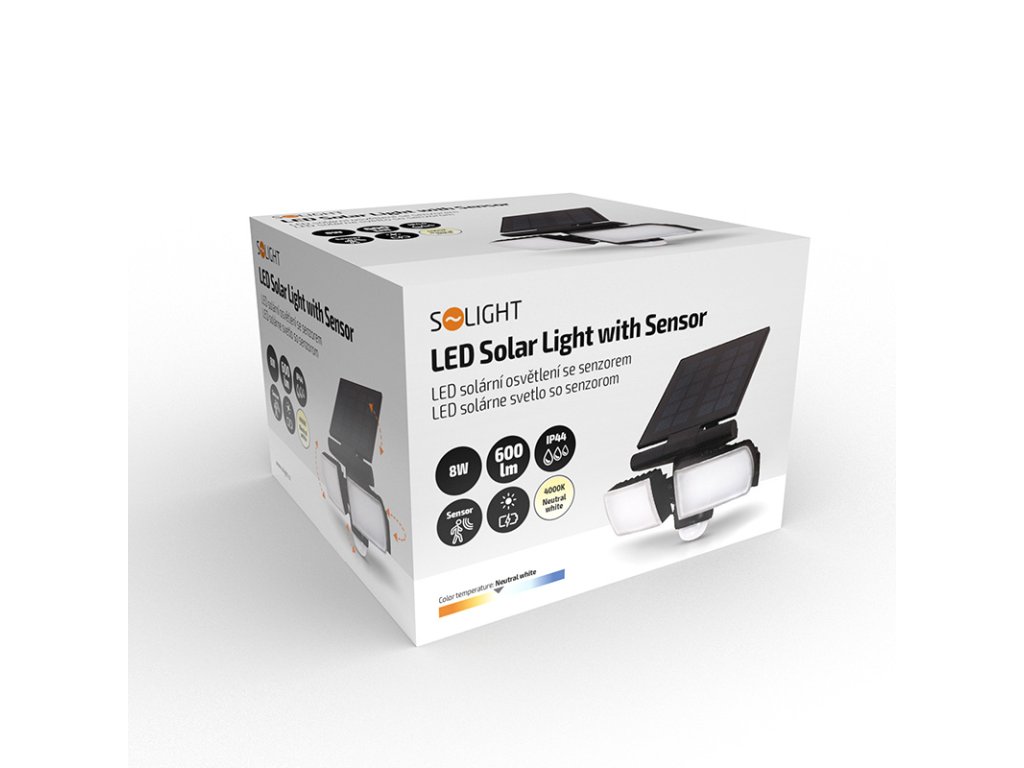 Solight LED solárne svetlo so senzorom, 8W, 600lm, Li-on, čierna