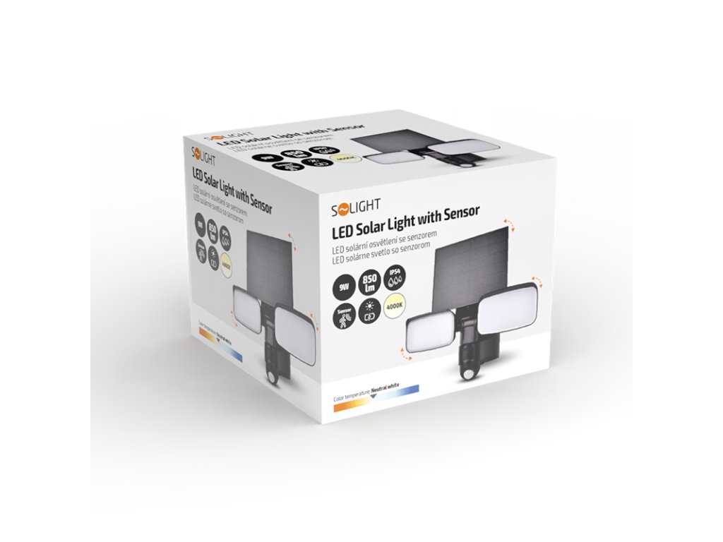 Solight LED solárne svetlo so senzorom, 9W, 850lm, 4000K, Li-Ion, čierna