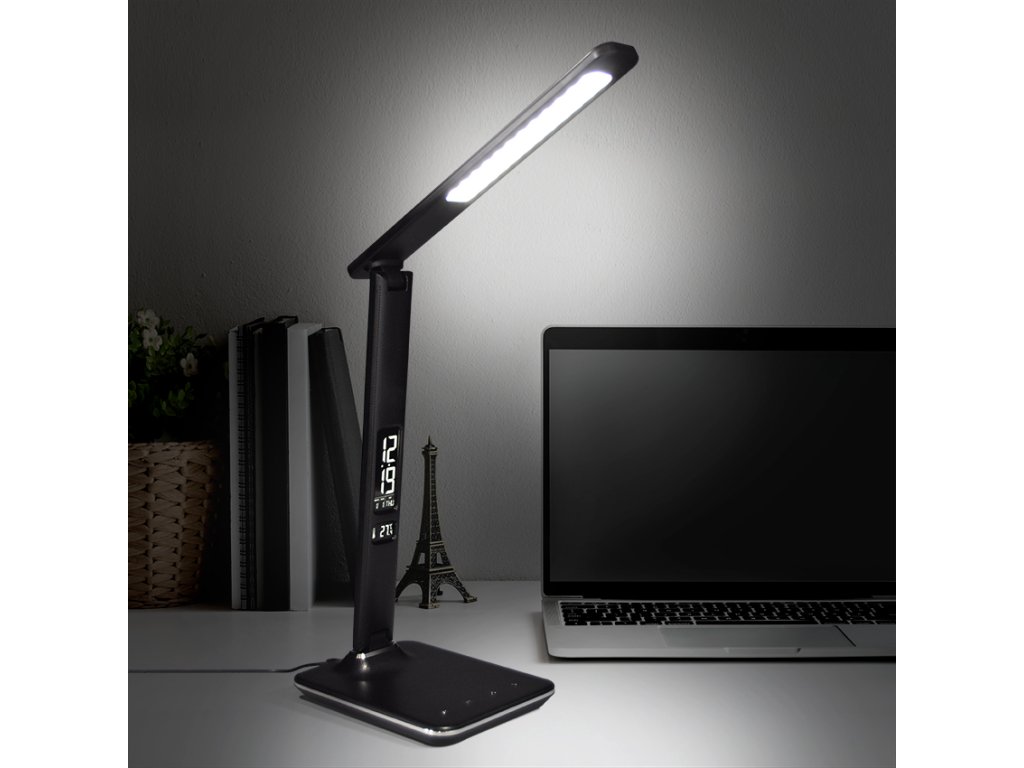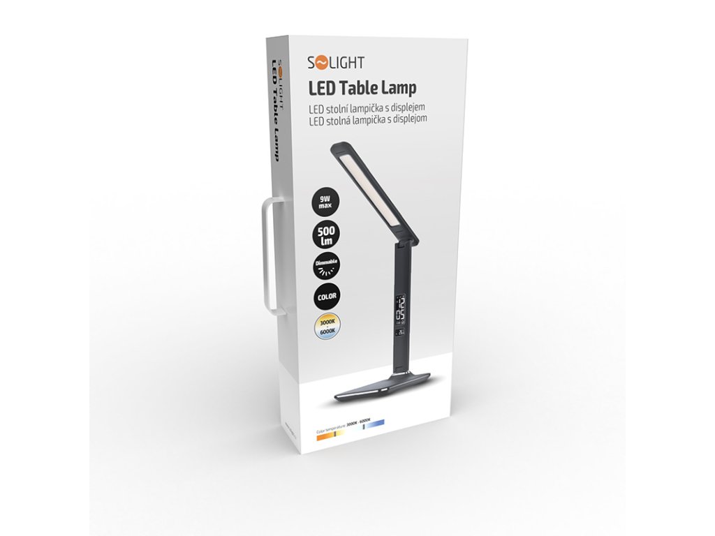 Solight LED stolná lampička s displejom, 9W, voľba teploty svetla, koža, čierna