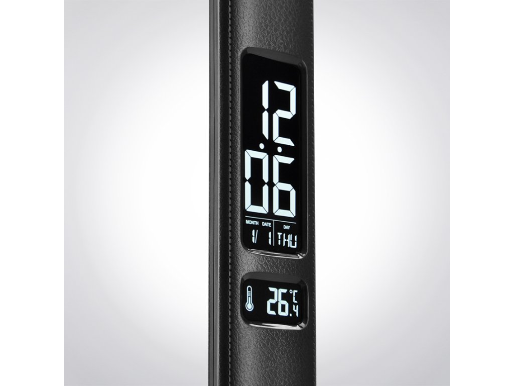 Lampa je vybavená prehľadným displejom s funkciami hodín, budíka, kalendára a teplomera. Maximálny príkon je 9 W, svetelný tok je až 500 lm a uhol svietenia je 120°. Ovládanie je pohodlné dotykom základne, ktorá je navyše protišmyková. Napájanie je zo siete (AC 100-240 V) a dĺžka kábla je 140 cm. Telo lampy je kombináciou materiálov ABS a PS, rozmery sú 116x181x410 mm. Zabudovaný LED zdroj napájania nie je možné meniť. Energetická trieda G.