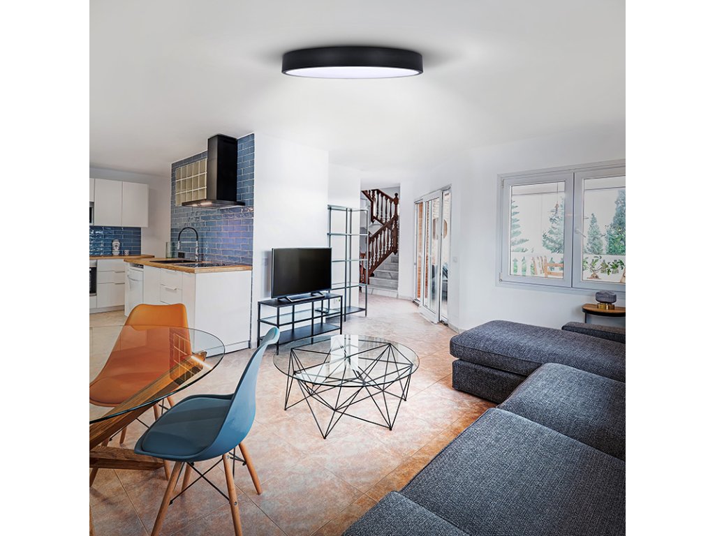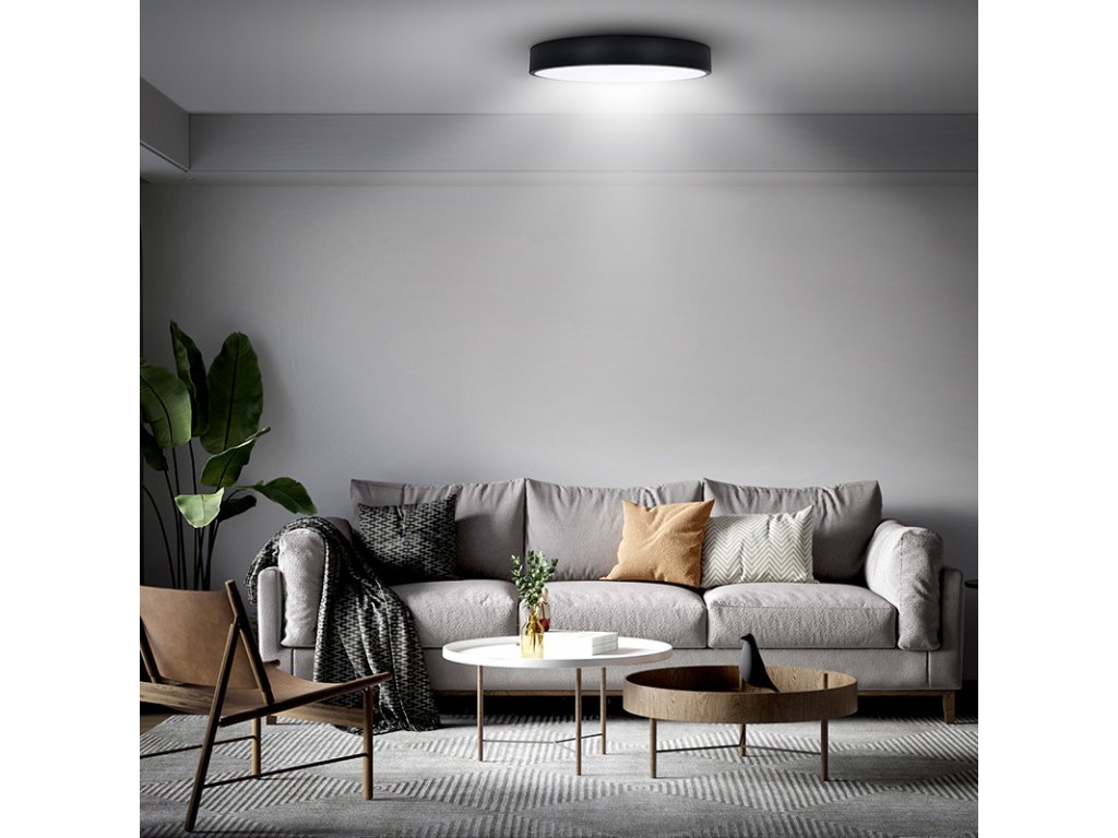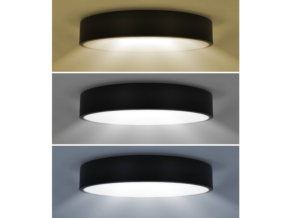 Výkonné stropné LED svietidlo s príkonom 48 W ponúka nastaviteľné svetlo v troch teplotách chromatickosti: 3000 K, 4000 K a 6000 K. S užitočným svetelným tokom až 2900 lm a vyžarovacím uhlom 120° uhlový priestor poskytuje jasné a rovnomerné. Prepínanie teploty svetla umožňuje prispôsobiť atmosféru priestoru podľa aktuálnej potreby – od útulného teplého tónu po ostré denné svetlo.