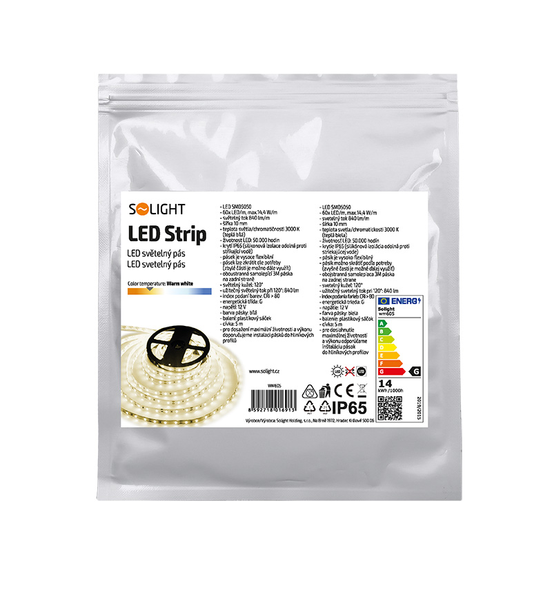 Solight LED svetelný pás, 5m, SMD5050 60LED/m, 14,4W/m, IP65, teplá biela