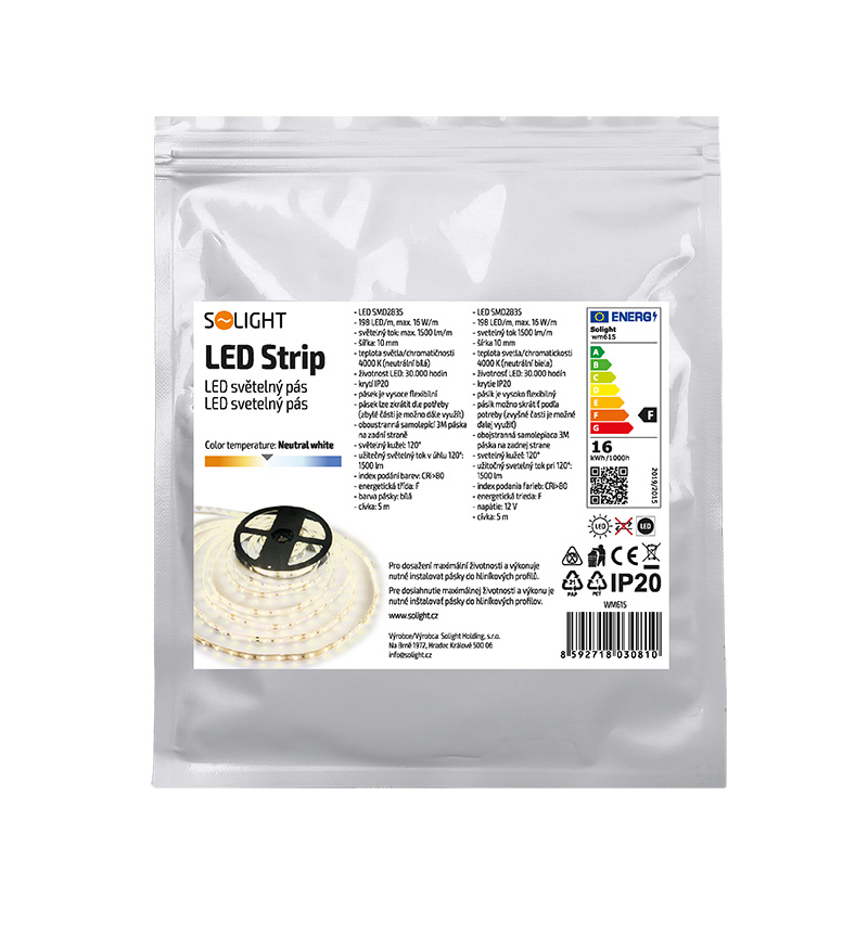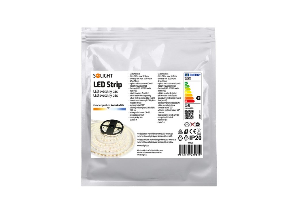 Pás LED je vybavený kvalitnou samolepiacou páskou 3M, ktorá zabezpečuje pevné upevnenie na rôznych povrchoch. Vďaka možnosti strihania pásky ju možno presne prispôsobiť konkrétnej inštalácii, pričom zvyšné časti možno ďalej používať. Index podania farieb CRI >80 prispieva k vernému podaniu farieb, zatiaľ čo 120° svetelný kužeľ zabezpečuje rovnomerné osvetlenie. Na dosiahnutie maximálnej životnosti (až 30 000 hodín) odporúčame inštaláciu na hliníkový profil, ktorý účinne odvádza teplo.