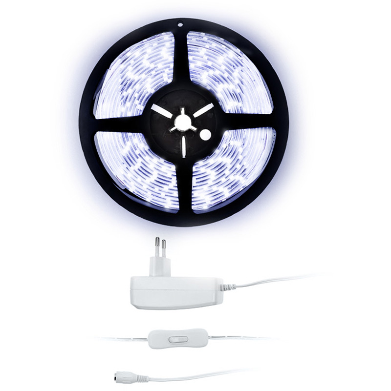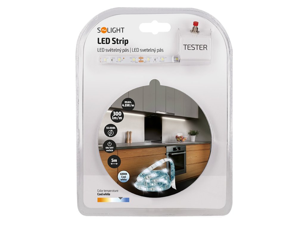 Solight LED svetelný pás s testrom, 5m, sada s 12V adaptérom, 4,8W/m, IP20, studená biela