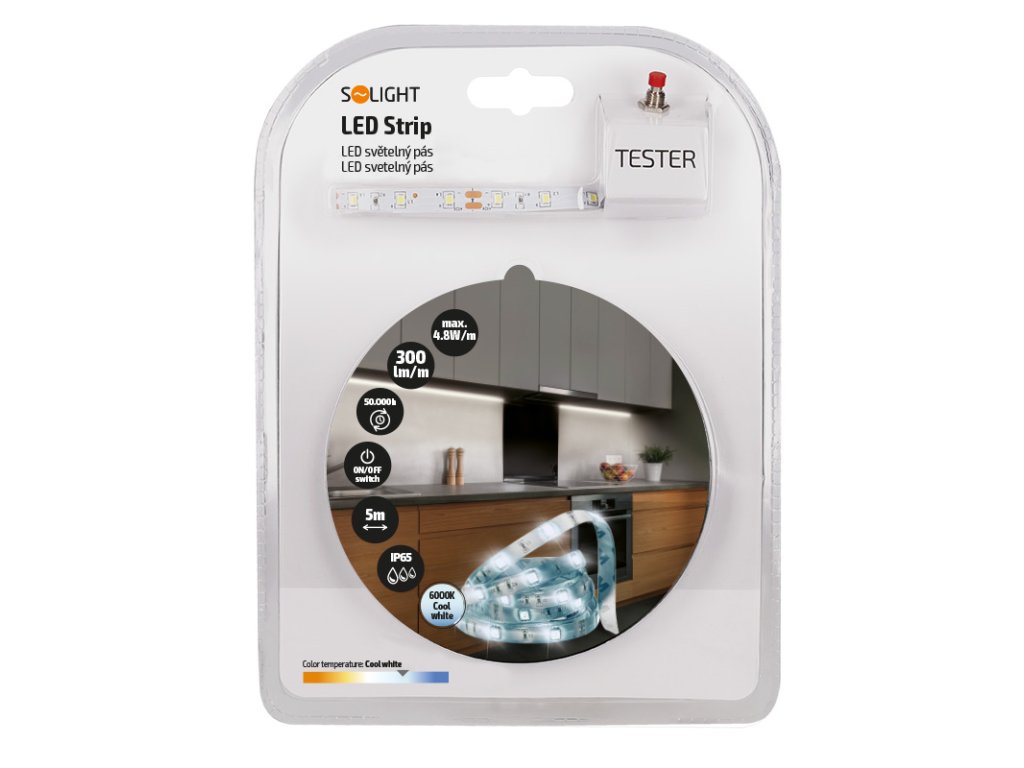 Solight LED svetelný pás s testrom, 5m, sada s 12V adaptérom, 4,8W/m, IP65, studená biela