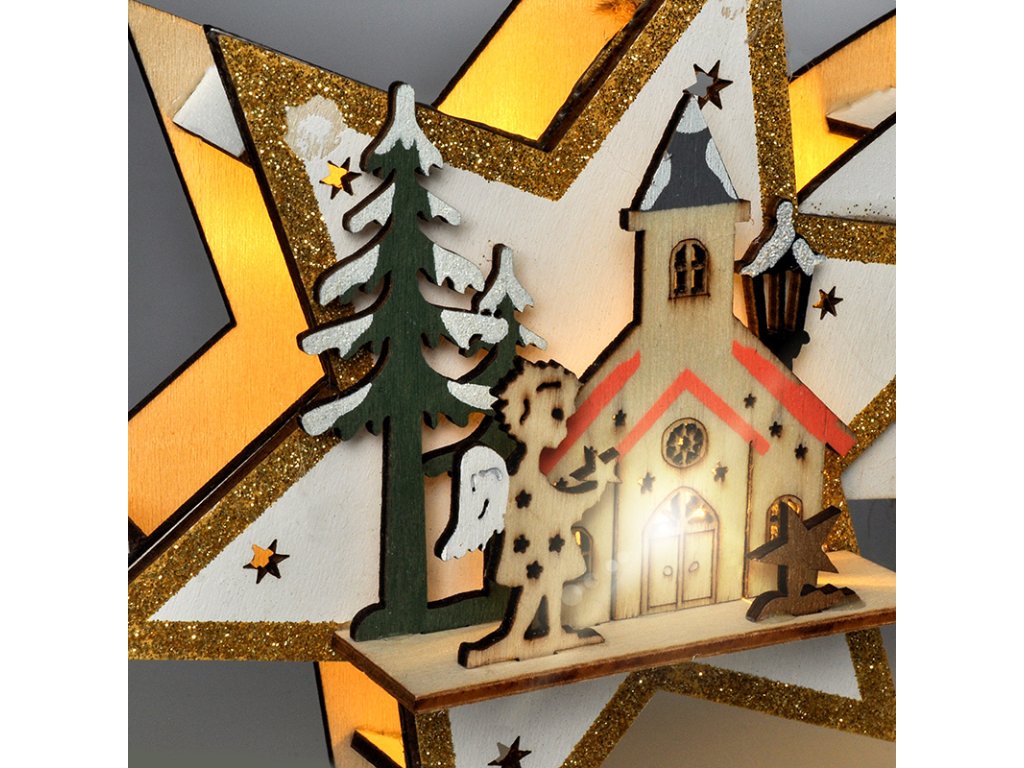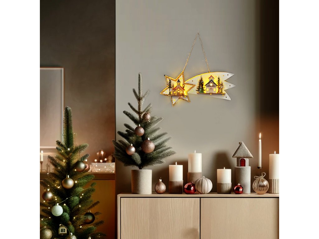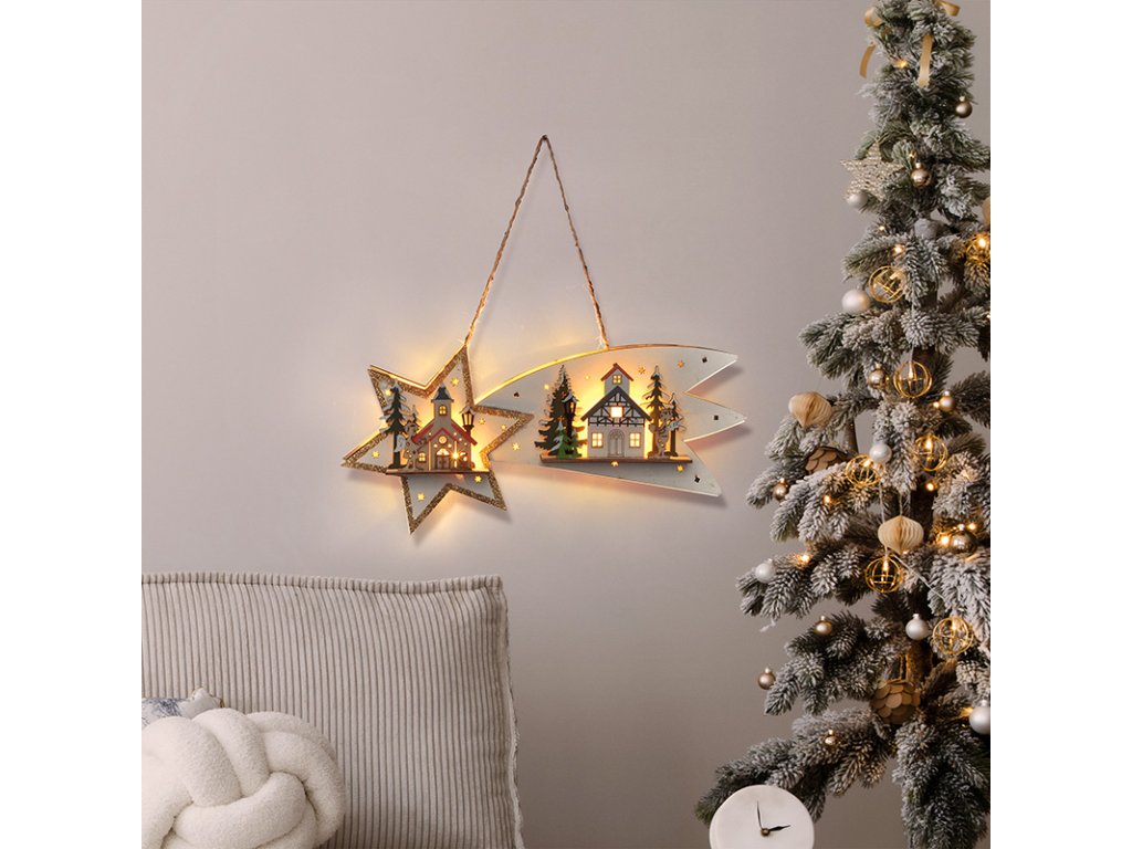 Elegantná drevená dekorácia v tvare vianočnej kométy s 10 LED diódami krásne doplní vašu zimnú výzdobu. Teplé biele svetlo osvetľuje celý tvar kométy a vytvára efekt padajúcej hviezdy. Vďaka rozmerom 31 × 6 × 14 cm a praktickému závesnému pútku ju ľahko umiestnite na dvere, stenu alebo okenný rám.