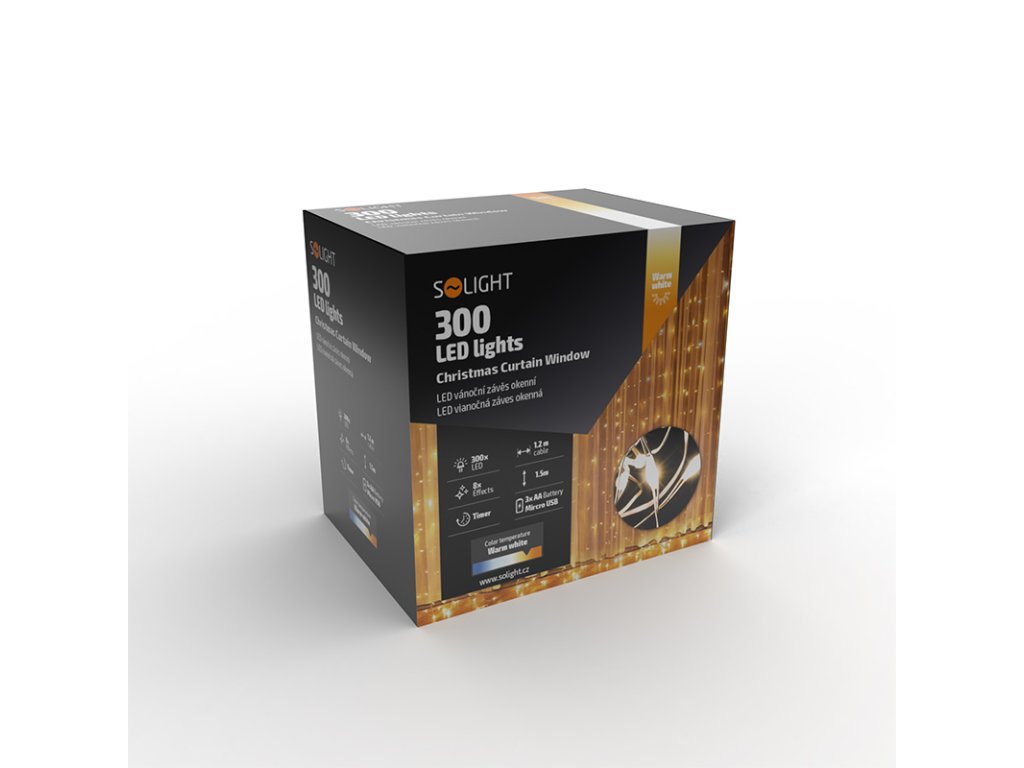 Solight LED vianočná záves okenná, strieborná, 300x mini LED, časovač, 8 funkcií, USB