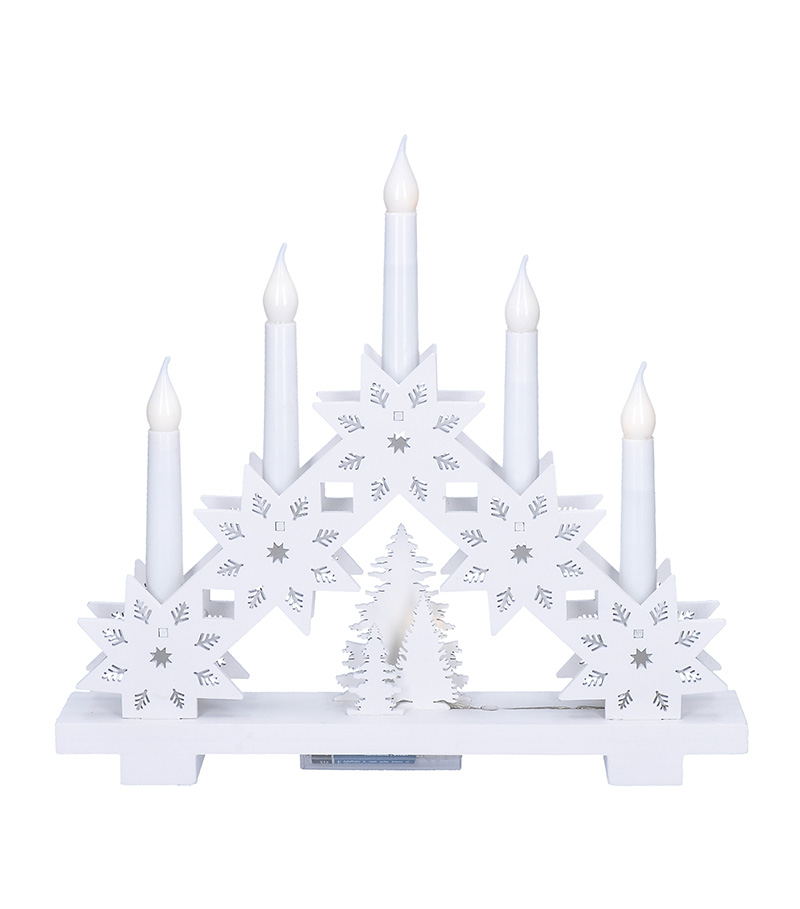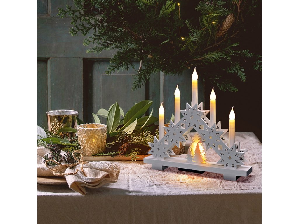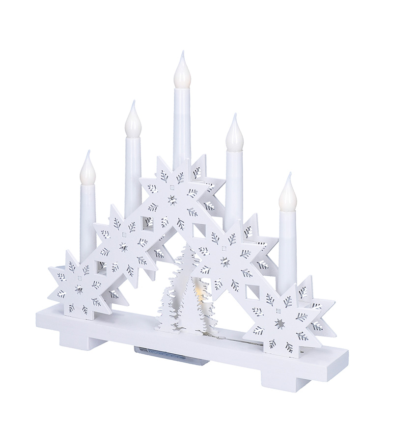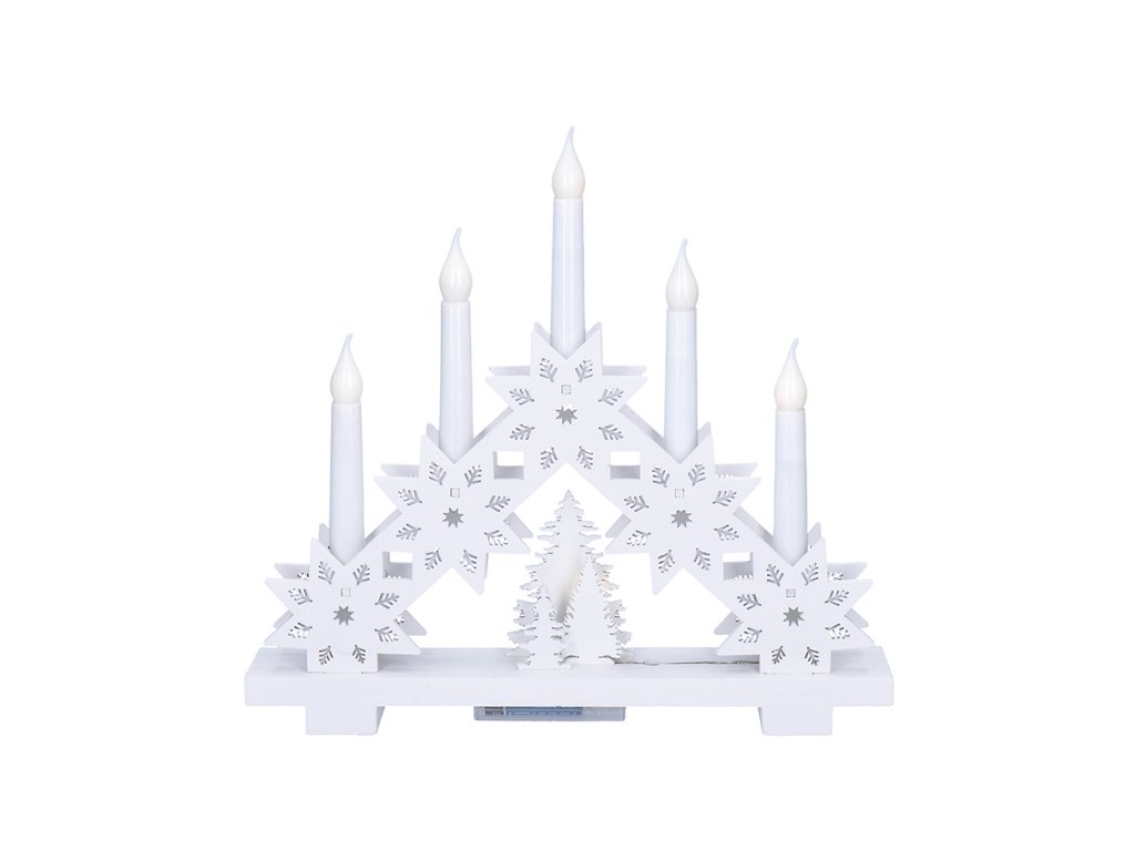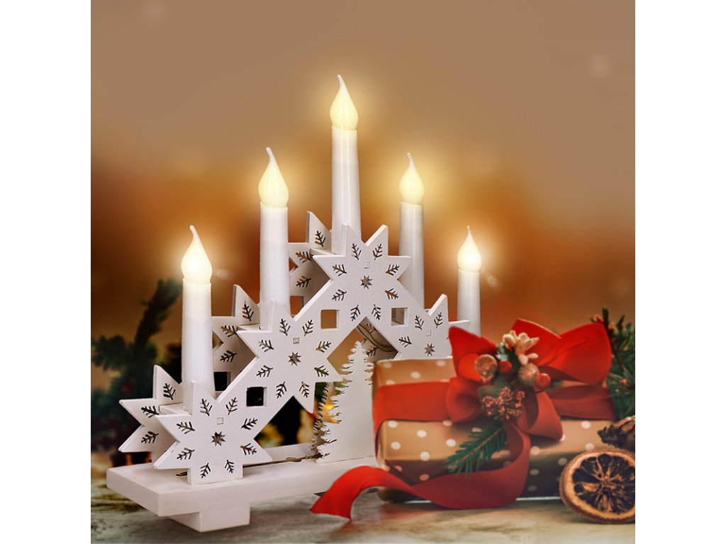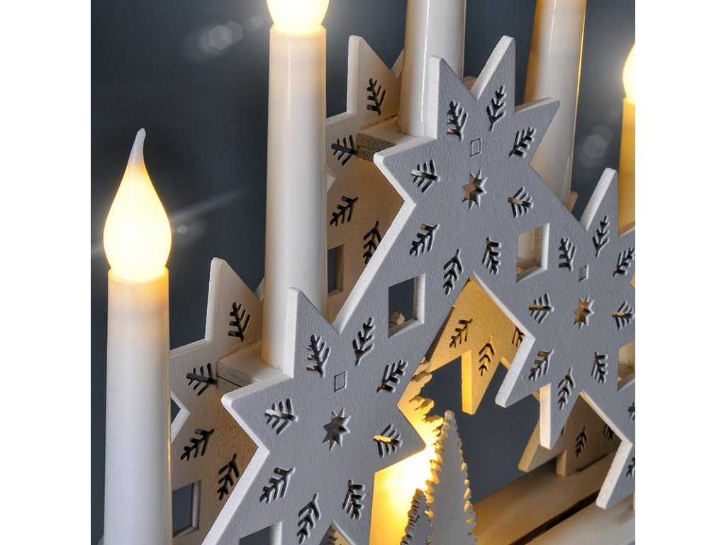 Štýlový drevený svietnik s piatimi LED diódami a motívom hviezdy prináša moderný pohľad na klasickú vianočnú dekoráciu. Biely povrch v kombinácii s čistými líniami pôsobí elegantne a vkusne, zatiaľ čo teplé biele svetlo navodzuje pokojnú a sviatočnú náladu. Sviečka má rozmery 32 × 30 × 5 cm a dokonale vynikne na parapete, polici alebo sviatočne prestretom stole.